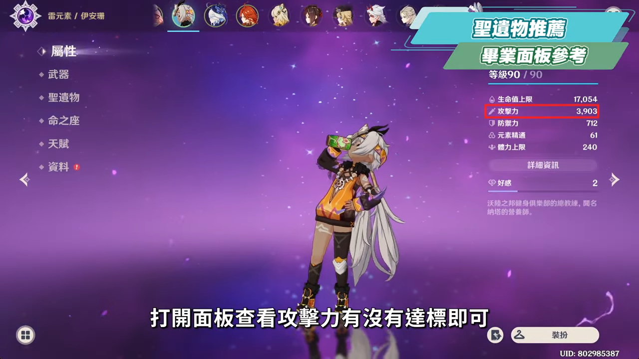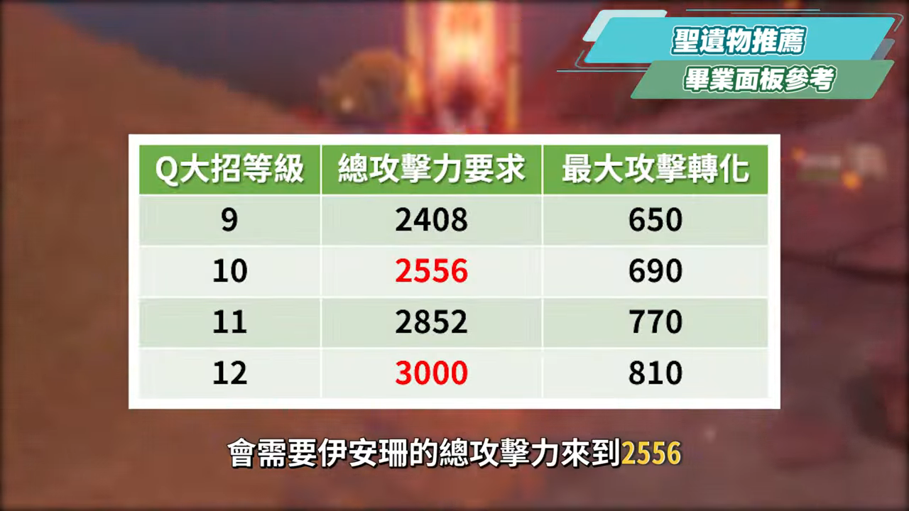 以10級情況下,會需要伊安珊的總攻擊力來到2556,而若是13級情況下,則會需要堆到3000的總攻擊力來吃滿攻擊加成,這裡洛洛也附上9~13級的各個總攻擊力要求,但若是吃不滿也沒關係,最好優先確保充能循環再來往這邊的總攻擊力上限要求來靠。這邊的總攻擊力指的是伊安珊吃滿所有BUFF後開大的攻擊面板,所以要檢查有沒有達標的話,可以在戰鬥中吃滿BUFF後打開面板查看攻擊力有沒有達標即可。