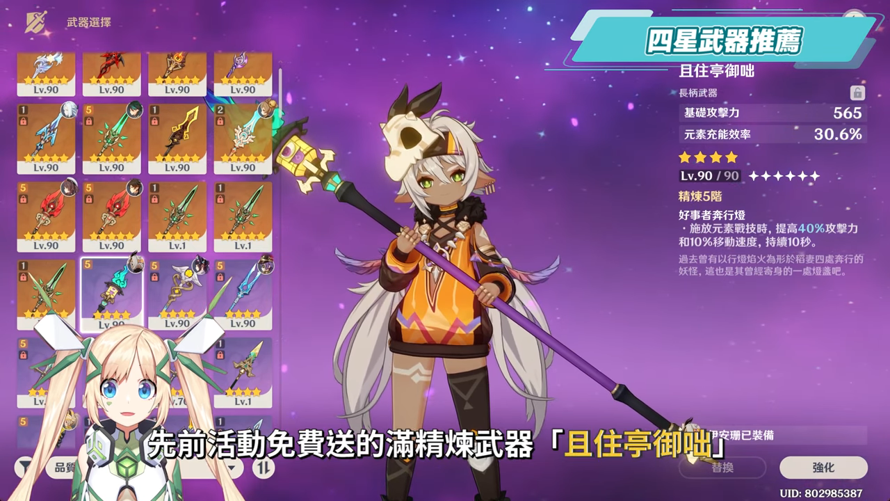 四星武器也有很多優質的選擇,其中洛洛會最為推薦先前活動免費送的滿精煉武器「且住亭御咄」,平民玩家只要有參加活動就可以免費拿到,就算沒有高精煉西風長槍也沒關係,而且也不用堆暴率,就可以在施放E後獲得40%的攻擊力提升,同時還加10%的移動速度,在探索時也能變相提供作用,副詞條也提供和西風長槍一樣的充能效率。唯獨比較可惜的是效果只提供10秒,會稍微有一些時間沒有覆蓋到。那如果錯過活動,就可以選擇高精煉「西風長槍」,只是因為武器效果的要求,會需要堆疊40%~50%左右的暴率,這樣才能更好的觸發額外的回能,也是一把很不錯的四星武器。而若是沒有高精煉「西風長槍」,也可以靠肝去釣魚換一把滿精煉「漁獲」,同樣也是很不錯的平民向充能武器。真的再懶,那就去鐵匠鋪鍛造一把「試作星鐮」吧。