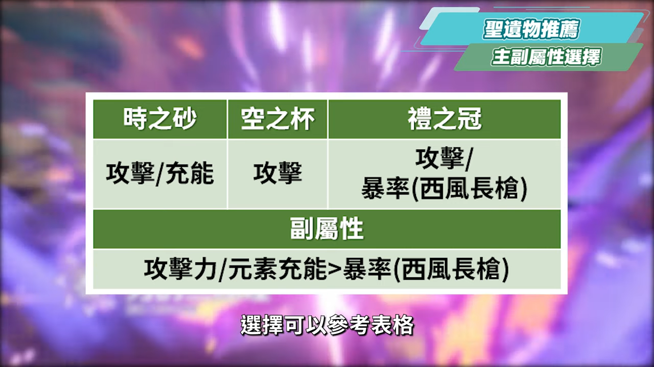 伊安珊的聖遺物主副屬性選擇可以參考表格,時之沙選擇攻擊,若大招循環不夠可以選充能,空之杯選擇攻擊,禮之冠選擇攻擊,若搭配西風長槍這類武器,可以讓暴率盡量堆到40~50%左右,副詞條則多考慮攻擊力和元素充能。