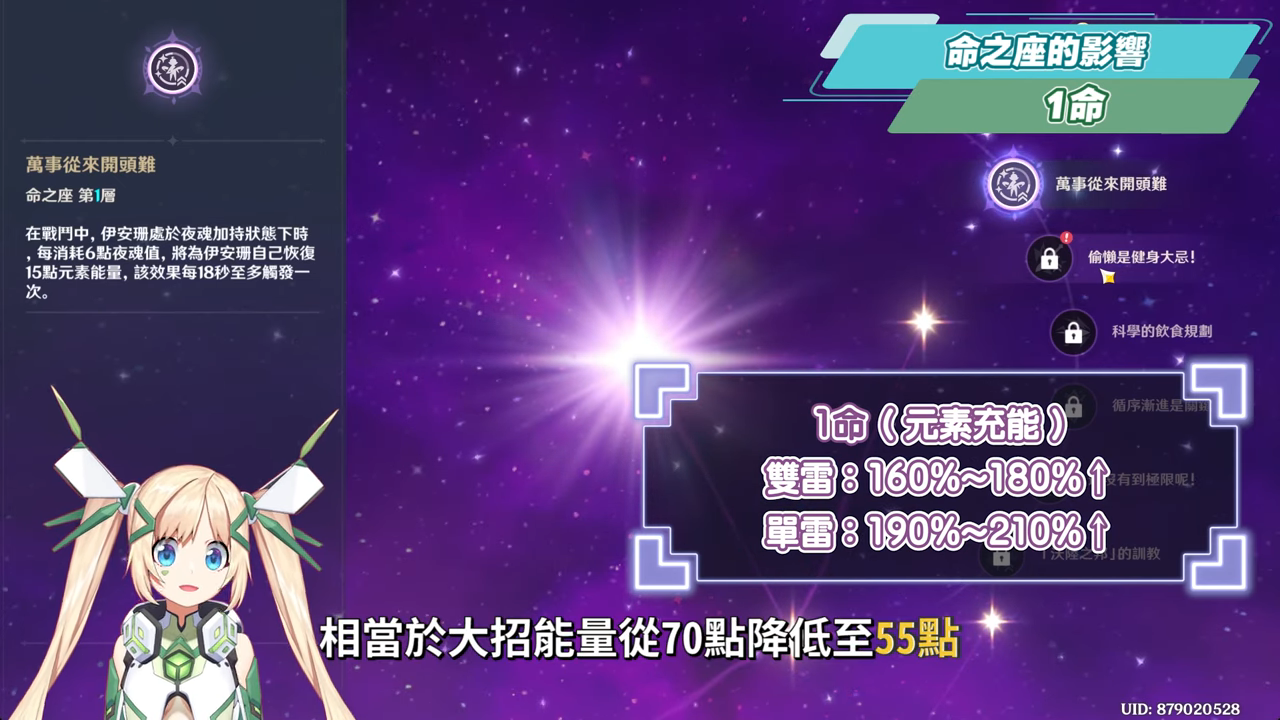 解鎖1命後,可以優化伊安珊的回能,處於夜魂加持狀態時,每消耗6點夜魂值,就恢復15點能量,相當於大招能量從70點降低至55點,也就可以多堆攻擊,來吃滿加攻上限。至此雙雷的元素充能效率就可以降低畢業標準來到160%~180%,單雷則可以降低至190%~210%。