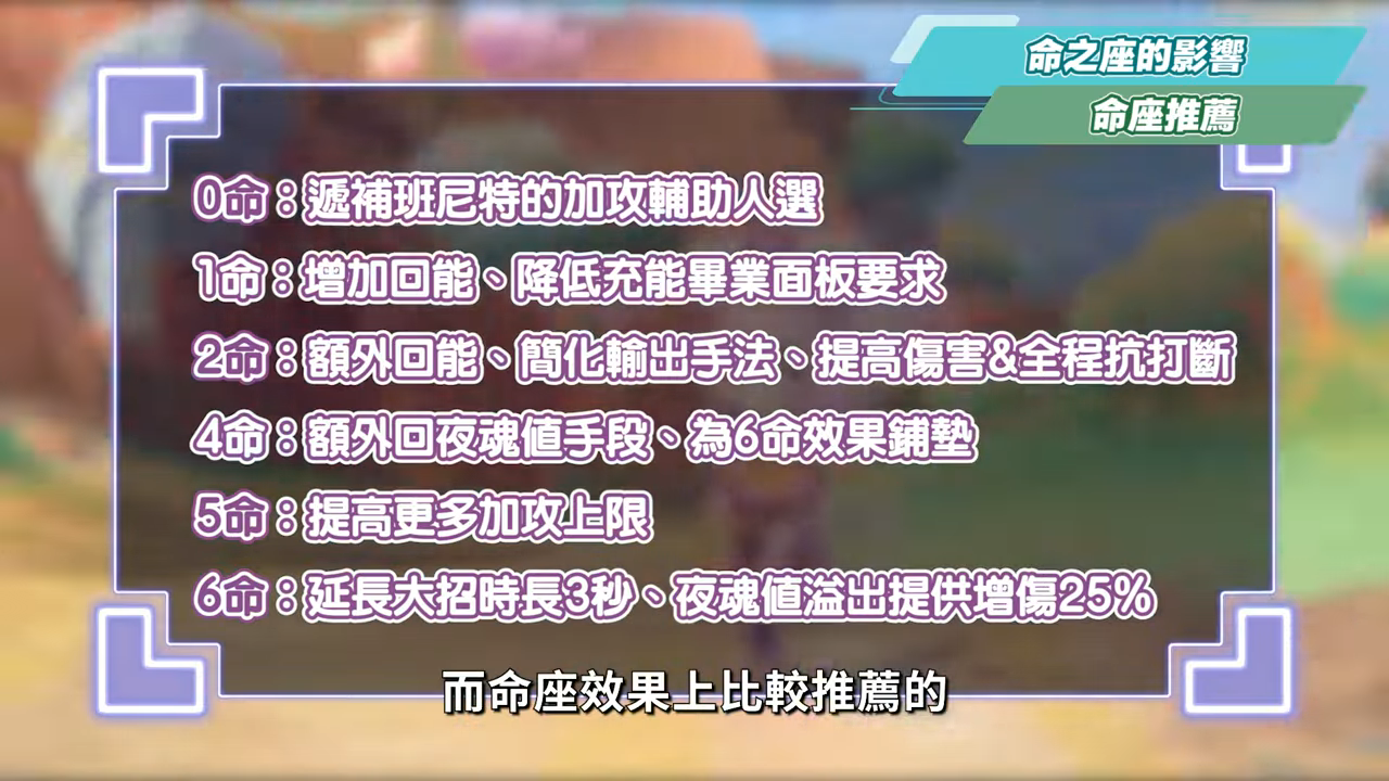 伊安珊的命座效果推薦,雖然伊安珊要到6命才有辦法在一些情況有超越班尼特的輔助能力,但總體的命座提升效果是比較平穩,並不到質變,主要是優化手感、同時再一層一層疊加上去輔助能力,到最後拼成滿命後的伊安珊,就會成為新一代六星真神的輔助角色,但0命的伊安珊其實也已經具備很不錯的效果,加上伊安珊和班尼特其實並不算競爭關係,更多還是緩解原本班尼特無法拆成兩半的情況,加上大部分人也都有培養班尼特,所以就算伊安珊命座還不高,主要也可以當成一個備選的加攻輔助人選來替換。而命座效果上比較推薦的會是2命、5命、6命,若剛好這次卡池有要抽的話,就可以加減抽個至少1隻0命伊安珊。
