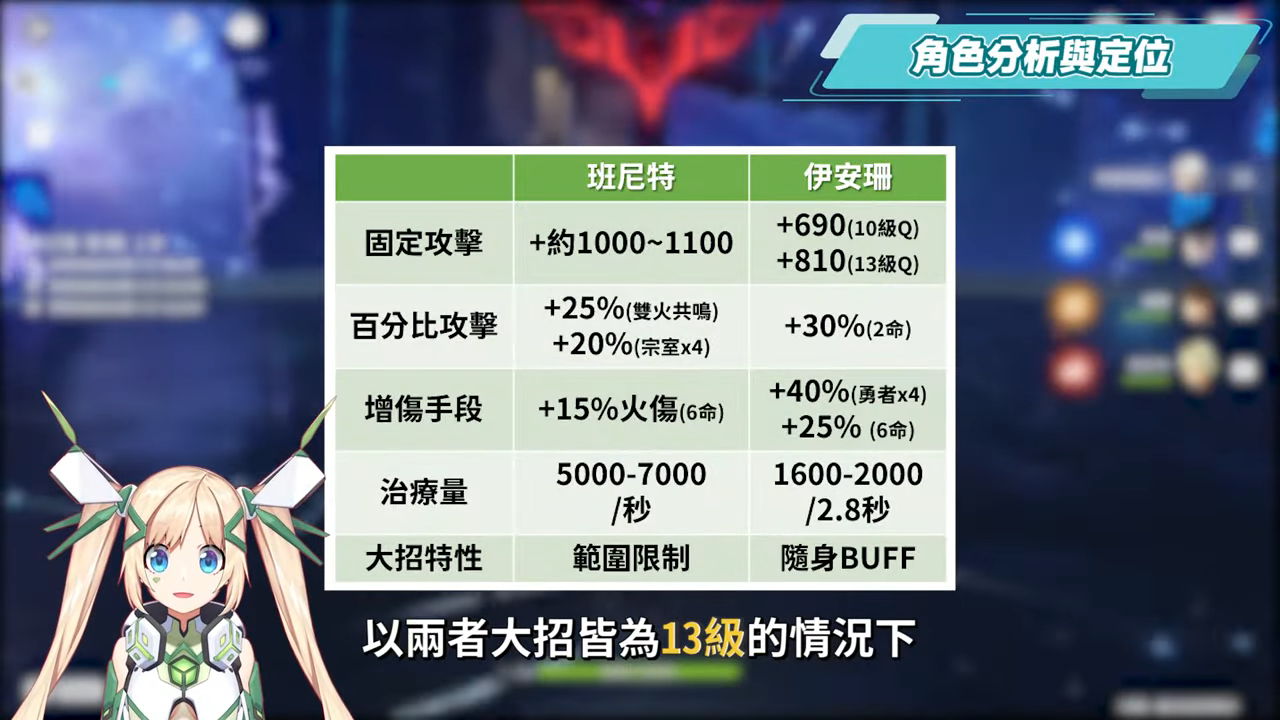 因此建立在你的攻擊模組主C培養越多的情況下,伊安珊的加入就會對你的配隊有很大的解放,讓班尼特不至於一直加班,變相是讓伊安珊去和班尼特做一個輪班互補,而反之,假如你生命模組主C培養的也多,那麼你在組隊上有沒有伊安珊只是稍微能夠多一種選擇。