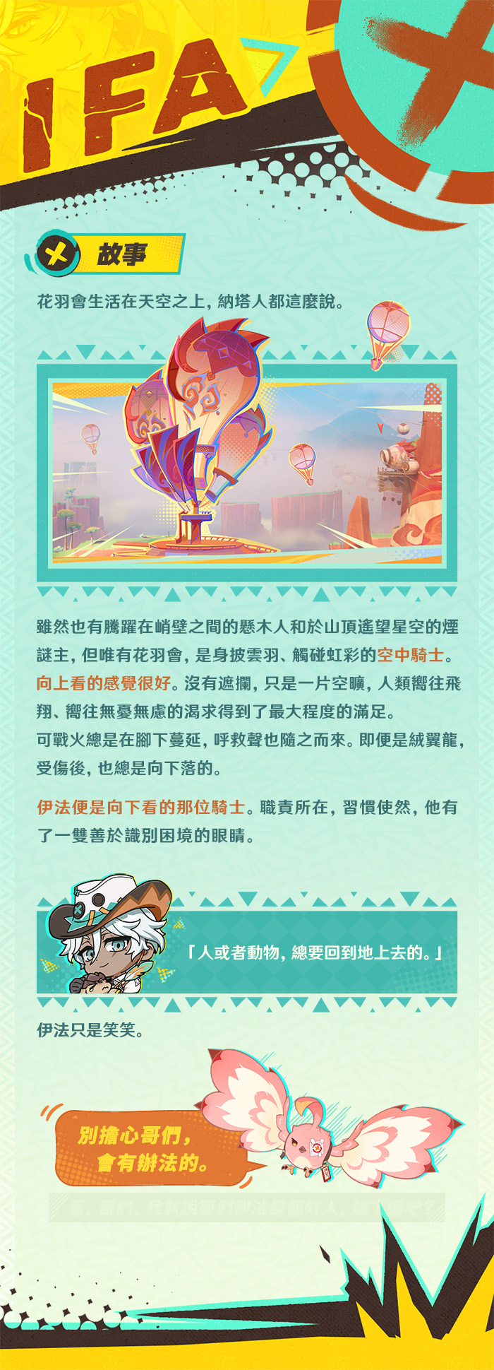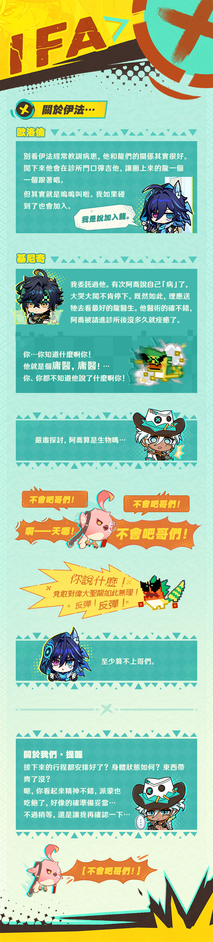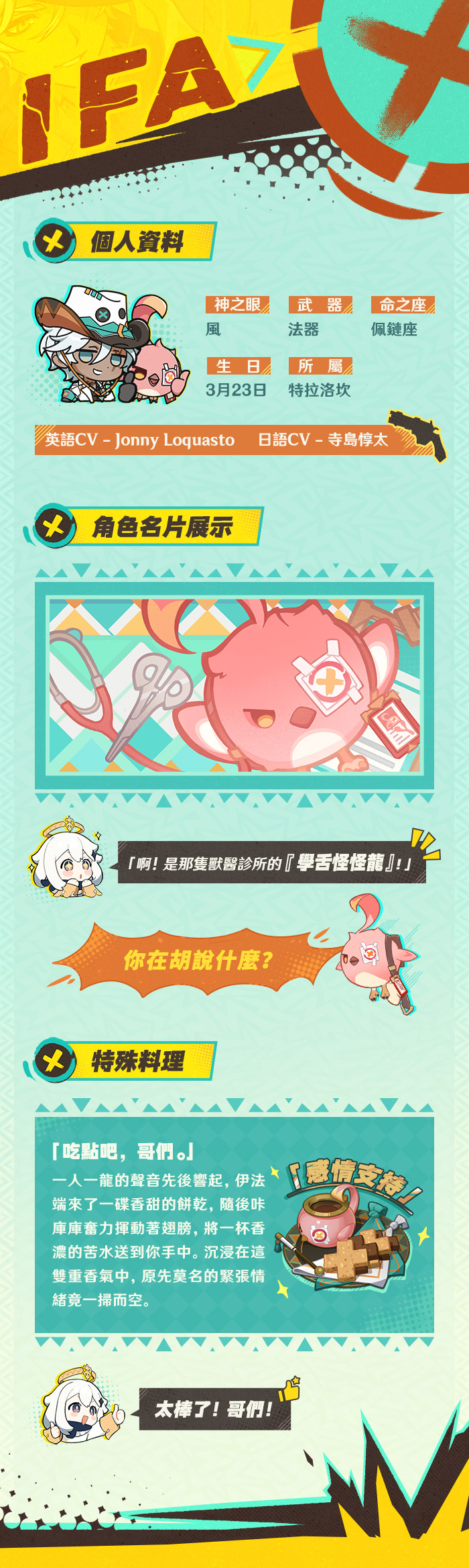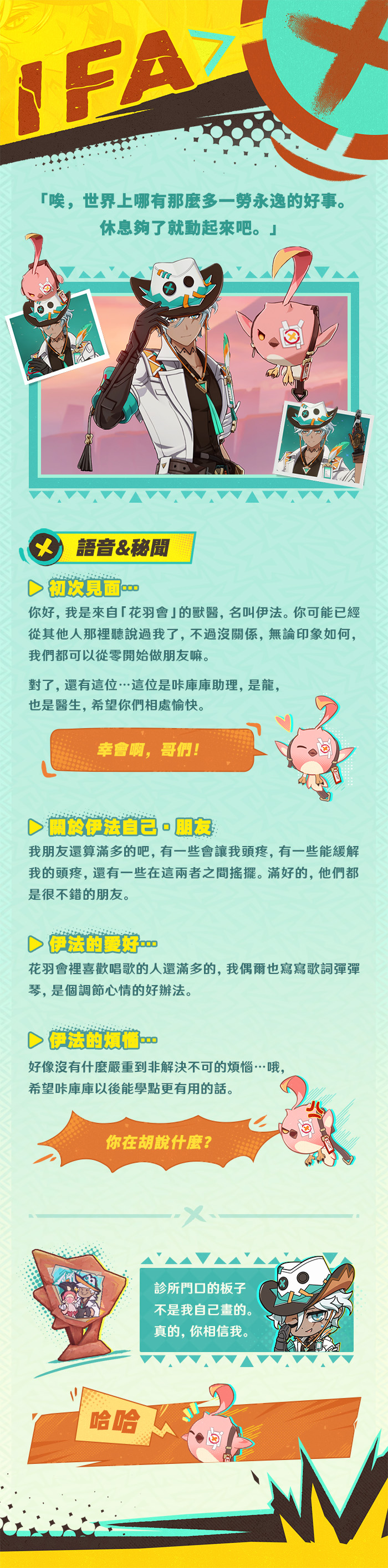 旅行者好呀!今天介紹的是來自「花羽會」的獸醫——伊法。聽說無論是多調皮的小龍,在他面前都乖乖地不亂動,醫治回來後都作息規律、不亂吃亂跑,幾乎再沒生過病…真有這麼厲害?一起來瞭解他吧!