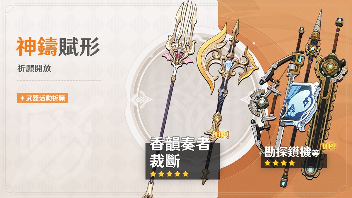● 活動期間,限定五星武器「長柄武器·香韻奏者」、「雙手劍·裁斷」的祈願抽取機率將大幅提升!