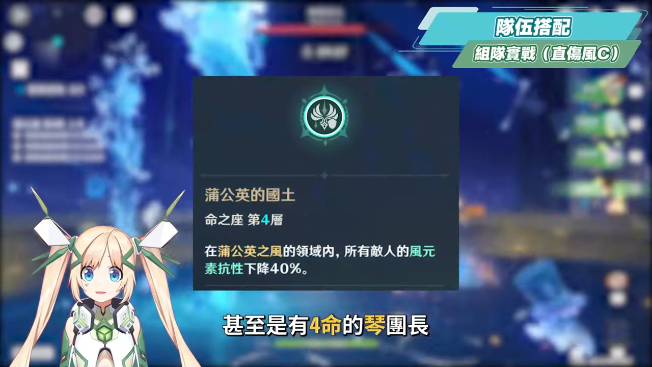 而若是直傷玩法,當風C玩得話就可以再帶上滿命琺露珊,提供減風抗、提高風傷、風傷倍率,以及6命的風傷暴傷等,風隊直傷必備專輔,配上增傷輔助最優人選芙寧娜,剩下則再搭配班尼特或伊安珊。甚至是有4命的琴團長。