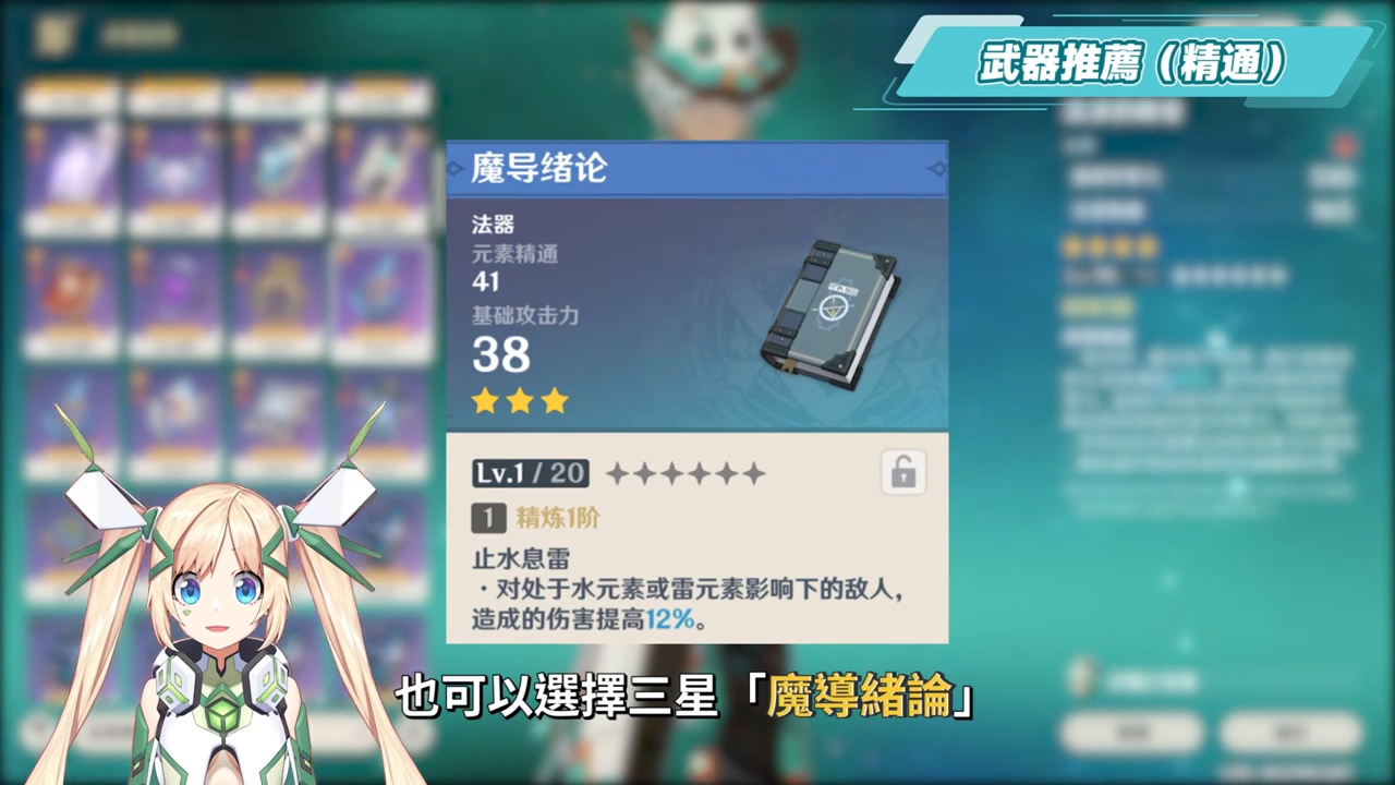武器推薦方面,作為夢見月伊法,五星武器的首選自然就是可以拿瑞希的專武「寢正月初晴」,效果最好,雖然伊法空中射擊屬於普攻,吃不到戰技加成的精通,但只要觸發擴散就可以加120精通,大招起手也可以再加32點精通,還是非常不錯的,只是這把武器屬於是先前瑞希剛入池時有抽的人才有的武器。其他武器也可以考慮精通相關的,像是茜特菈莉專武「祭星者之望」,只是吃不到創造護盾時的增傷,但可以無條件獲得100點精通加成。或是納西妲專武「千夜浮夢」,但因為伊法大多組在單風、最多雙風的隊伍中,因此精通加成只能吃到1~2層,略遜於「祭星者之望」。四星武器則可以選擇「祭禮殘章」、「流浪的晚星」等精通類武器。剛入坑的平民玩家也可以選擇三星「魔導緒論」,升滿也有187點精通。比升滿的四星「萬國諸海圖譜」來得更好。