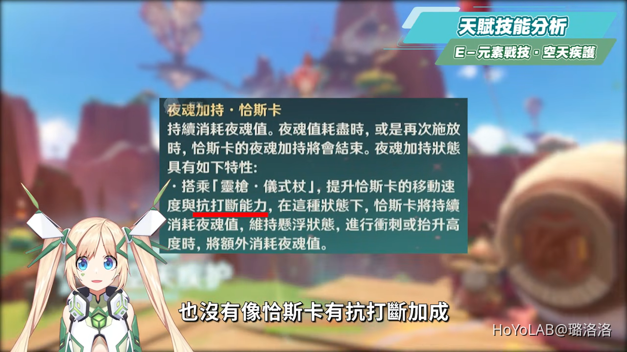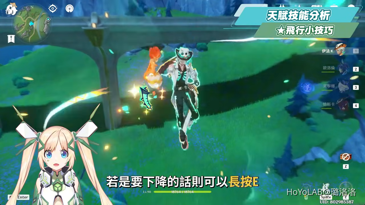 對於先前沒有抽恰斯卡的人,洛洛這邊也再分享一些關於飛行的小技巧。伊法在每輪戰技可以最多進行3次的點按衝刺飛行,若是長按衝刺疾飛的話約可以維持2.7秒、而若是長按跳躍鍵飛升的話則大約可以飛2秒,若是要下降的話則可以長按E,長按E再放開也會有一個轉身的動作,直往地面可以再打出下落攻擊。落地後就會結束夜魂加持狀態。若是被擊飛也可以透過點按閃避在空中回正。