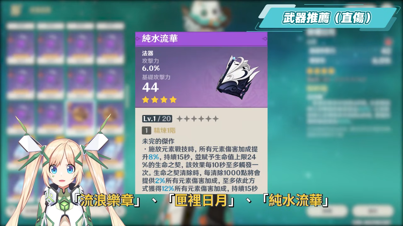 直傷玩法的伊法,則可以選擇雙暴類法器,其中表現最好的會是流浪者專武「圖萊杜拉的回憶」,主屬性提供暴傷,還提高普攻速度和普攻傷害。其他也可以考慮像是萊歐斯利專武「金流監督」、瑪拉妮專武「衝浪時光」、「四風原典」等五星武器。四星武器也可以搭配「流浪樂章」、「匣裡日月」、「純水流華」。選擇上其實蠻多的,洛洛這邊就不一一列舉,唯獨要注意的就是搭配暴率法器、又穿「黑曜」4件套時注意暴率不要溢出。