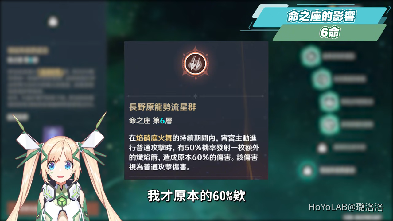 解鎖6命後,伊法夜魂加持狀態下的空中射擊,在長按普攻時,每發會有50%的概率額外打出一枚秘藥彈,基於伊法攻擊力的120%造成普攻風傷,能施加弱風元素附著,和其他普攻共享附著CD,不論是精通玩法或是直傷玩法都可以提高每輪戰技的輸出能力,並且在非戰鬥狀態下的夜魂值和燃素值消耗降低20%,優化大世界跑圖體驗。6命宵宮表示不開心,不是吧哥們,我才原本的60%欸!
