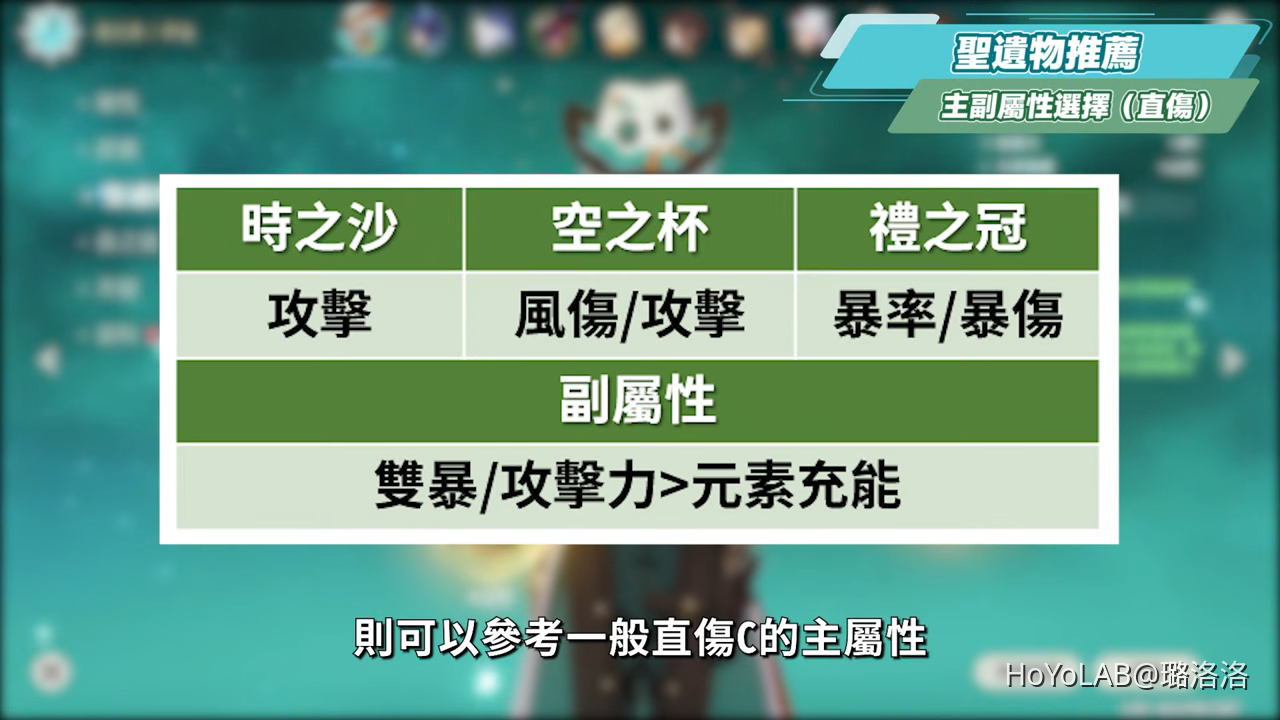 若是直傷玩法,則可以參考一般直傷C的主屬性,時之沙攻擊力、空之杯風傷或攻擊、禮之冠根據面板配平雙暴。