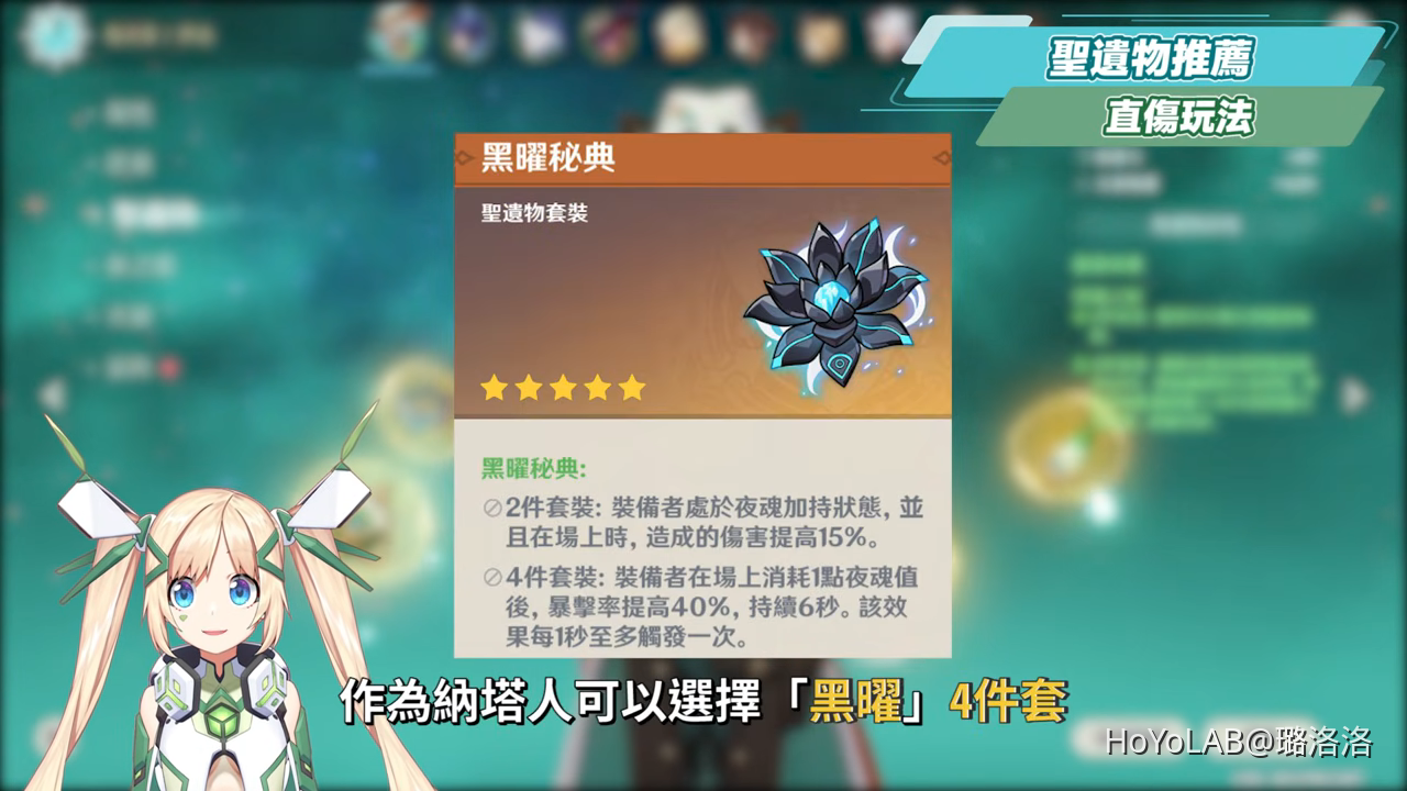 而若是走雙暴的直傷玩法,作為納塔人可以選擇「黑曜」4件套,又或是隊伍中有芙寧娜的話,也可以搭配「逐影獵人」4件套。但若是想要更好得讓大招吃到暴率加成,輸出手法上就會建議變成EQ起手,只是會稍微少了幾發射擊。