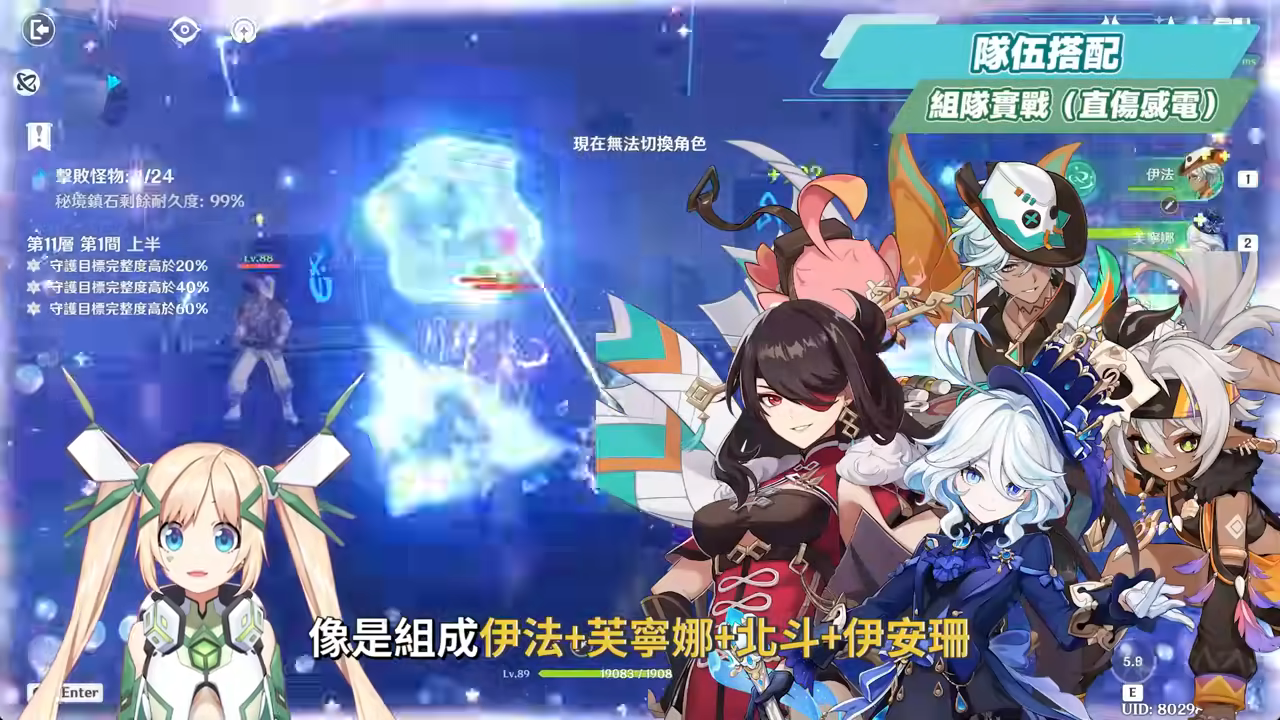 此外也可以選擇一種既打直傷又打感電的組法,像是組成伊法+芙寧娜+北斗+伊安珊,伊法同樣穿直傷配置的聖遺物,芙寧娜提供大量增傷,北斗提供護盾與掛雷,伊安珊提供攻擊,搭配伊法在空中持續移動,也可以再吃到攻擊加成。