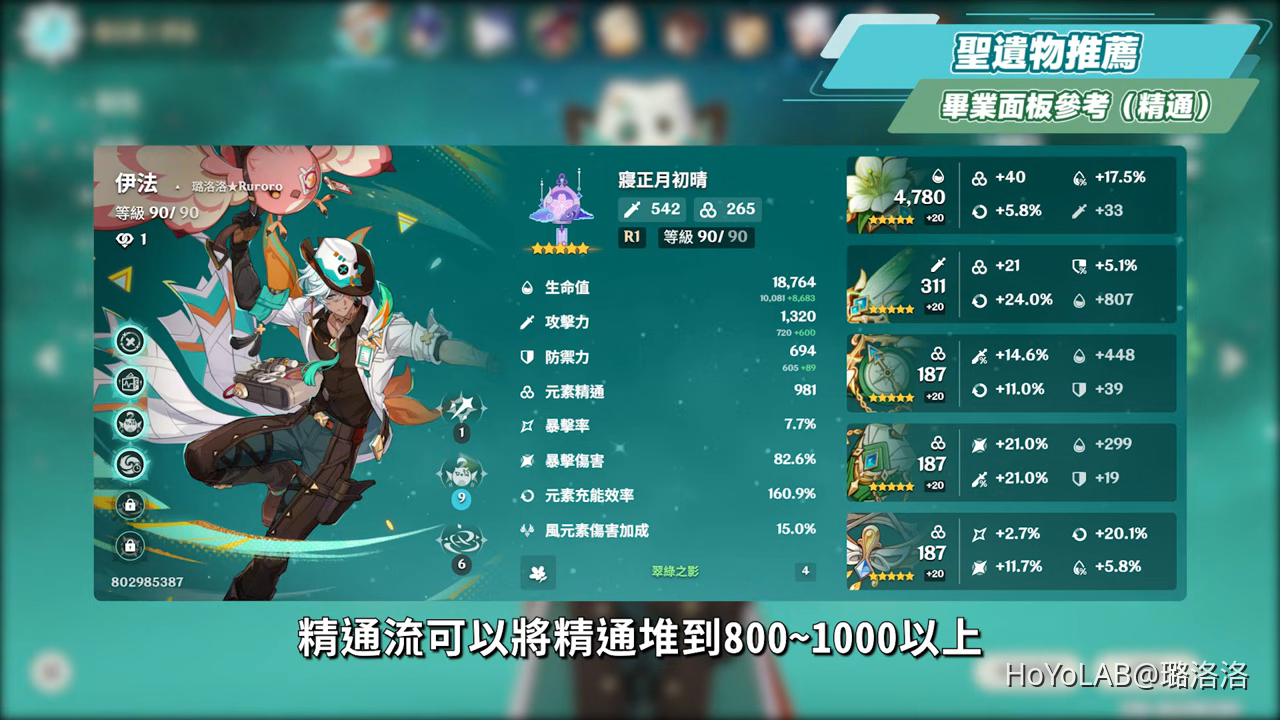 伊法的畢業面板參考,精通流可以將精通堆到800~1000以上,其餘充能可以在130~150%,主要就是大招的傷害循環。