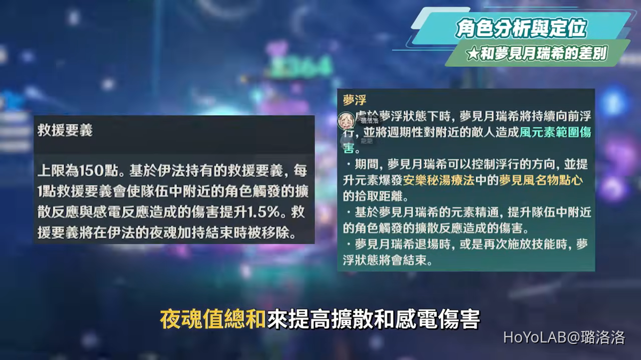 也因為伊法的機制和夢見月瑞希有許多相似點,因此這裡洛洛也補充一下伊法和瑞希之間的差異。他們兩個的相似點就是同樣都是風元素法器的站場角色,也都能提高擴散傷害,不同的地方則是伊法可以打普攻,而夢見月瑞希則不行,因此伊法除了感電駕駛員之外,也可以轉成直傷玩法。此外伊法是透過隊伍中的夜魂值總和來提高擴散和感電傷害,而瑞希則是從自身精通來去轉化。