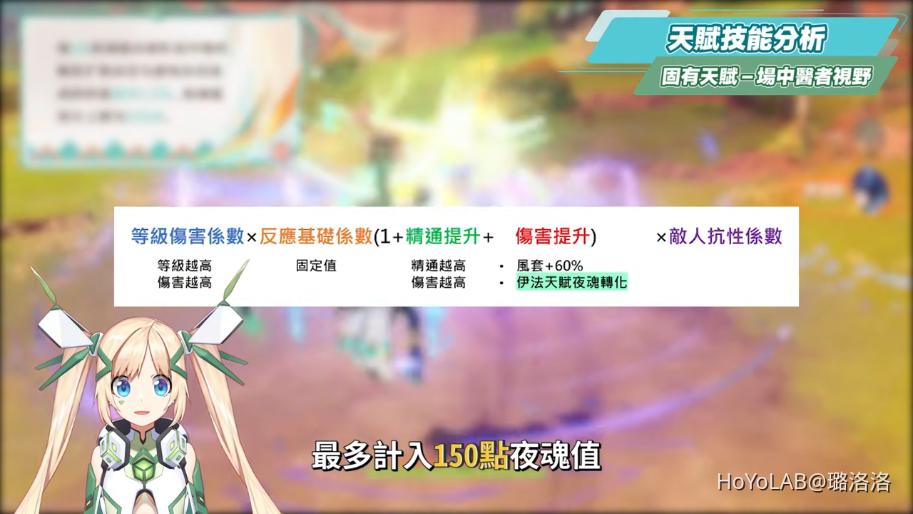 搭配固有天賦「場中醫者視野」,伊法在夜魂加持狀態時,可以按照全隊當前的夜魂值總和,每1點能提高1.5%全隊造成的擴散或感電傷害,最多計入150點夜魂值。