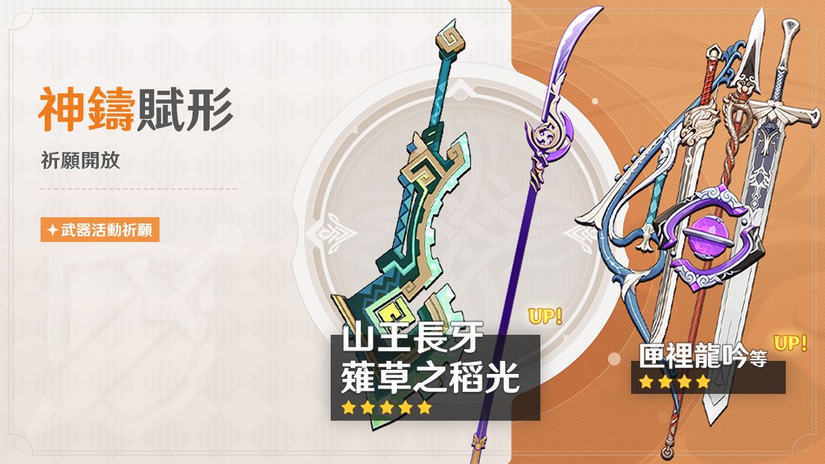 「神鑄賦形」祈願:「雙手劍·山王長牙」、「長柄武器·薙草之稻光」機率UP!