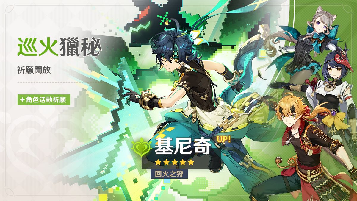 ● 活動期間,限定五星角色「回火之狩·基尼奇(草)」的祈願抽取機率將大幅提升!