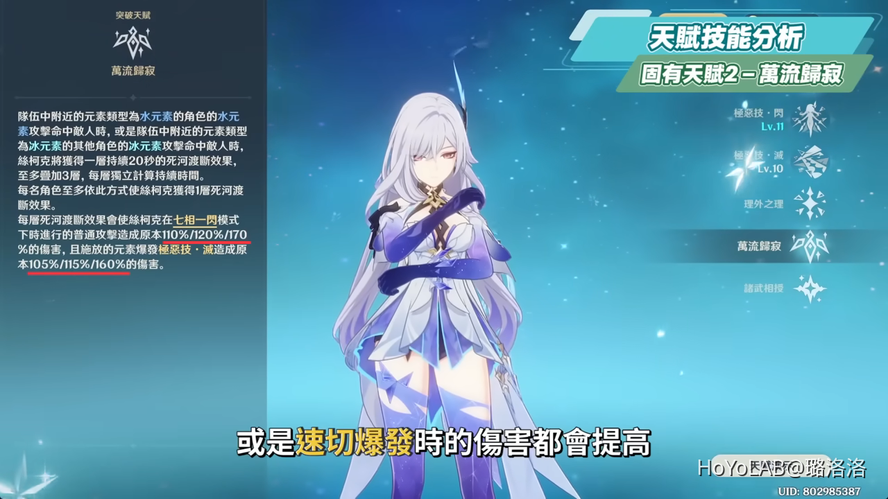 當有這個BUFF效果時,能使絲柯克在普攻站場或是速切爆發時的傷害都會提高,最多疊加3層,我們也可以看到當只有2層和3層時的倍率差距也是相當大,普攻就差了50%增傷、大Q的傷害也差了45%增傷,而且這邊的增傷乘區不是一般的增傷區,而是幾乎等同於獨立乘區的增傷倍率,類似那維萊特的天賦效果一樣,因此隊友的組成對絲柯克來說是很重要的,也就是隊伍中最好都是由3名水或冰隊友來組成才能吃滿最大增傷,少了最大增傷,絲柯克的傷害也就打不出來。