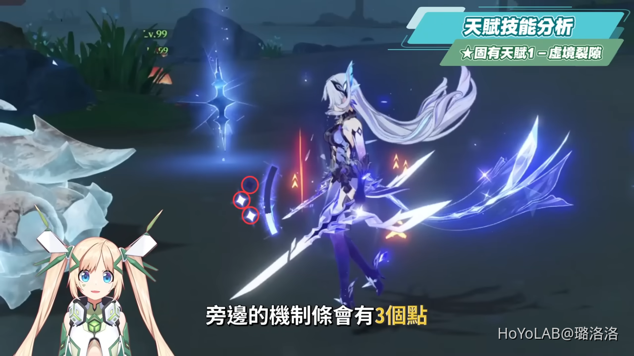 如果擔心在打架時,當前的傷害和效果很花,怕看不清楚場上有幾枚「虛境裂隙」,也可以觀察絲柯克角色旁邊的機制條會有3個點,只要亮起1個點就表示附近有1枚「虛境裂隙」。