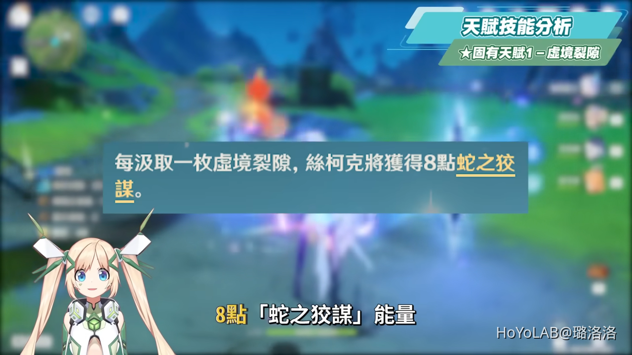 再來是要如何獲取這個「蛇之狡謀」的特殊能量呢?這時就要再透過一樣叫作「虛境裂隙」的特殊機制,也就是這個長得很像寶咖咖還是小魚乾之類的東西,總之就是絲柯克要把這個零食吸收進去,就可以回復「蛇之狡謀」。這個「虛境裂隙」,可以透過隊伍中任意角色觸發超導、凍結、冰元素擴散、冰元素結晶等反應來生成,也就是除了融化以外的冰元素相關元素反應,每2.5秒可生成1枚,場上最多存在3枚。每1枚「虛境裂隙」可以轉化為8點「蛇之狡謀」能量,並進而提高絲柯克的普攻傷害。