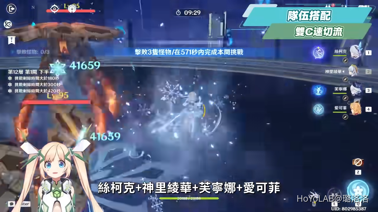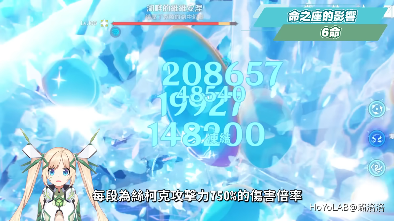 再來實戰演示的部分,首先是洛洛認為絲珂克最高級別的水冰永凍隊組成,可以是絲柯克+6命申鶴+芙寧娜+愛可菲。這隊主要就是申鶴EQ掛冰上BUFF和減抗→芙寧娜EQ上水觸發凍結和增傷→愛可菲EQ觸發凍結後,絲柯克短E+小Q站場輸出,中間重擊再吸收一波裂***狀態結束,丟大Q收尾,再次新的一輪循環。