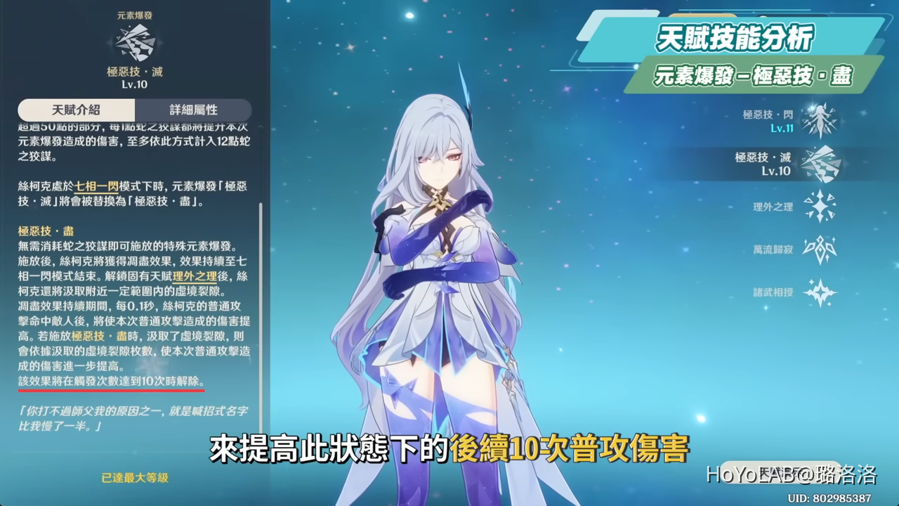 最後的6命雖然敘述落落長,但總體來說也是一個數值命座,第一個效果類似1命,同樣是在吸收裂隙後觸發,每1枚裂隙會給絲柯克1層「極惡技·斬」的效果,最多可疊加3層,可以讓絲柯克有最多3次的協同攻擊次數。假如是絲柯克在開大Q時,此時最多可以再同時打出3段協同攻擊傷害,視為元素爆發傷害。每段為絲柯克攻擊力750%的傷害倍率。