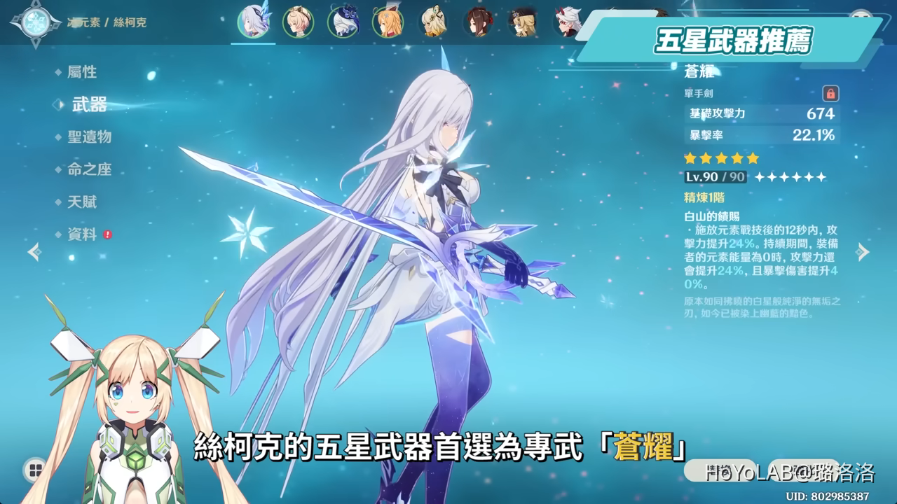 絲柯克的五星武器首選為專武「蒼耀」,在裝備者施放元素戰技後的12秒內,使其攻擊力提高,並在裝備者元素能量為0時,攻擊力會再進一步提升,同時還提供大量暴傷,後半段的效果也是基於絲柯克的機制來量身打造。而雖然專武提供的數值非常不錯,但目前現有的五星武器中,也有傷害差距不大的下位替代選擇,比較喜歡走站場普攻玩法的,也可以選擇「波亂月白經津」,又或是到現在還是很好用的五星綠劍「磐岩結綠」,和「霧切之回光」都可以玩站場或速切打法,有這三把武器可以選擇的話,想再提升絲父的能力,也可以優先往命座提升。其他還有像是單純吃武器白值,或是主屬性提供的雙暴,搭配部分被動效果的五星武器,像是千織專武「有樂御簾切」、克洛琳德專武「赦罪」、艾爾海森專武「裁葉萃光」。