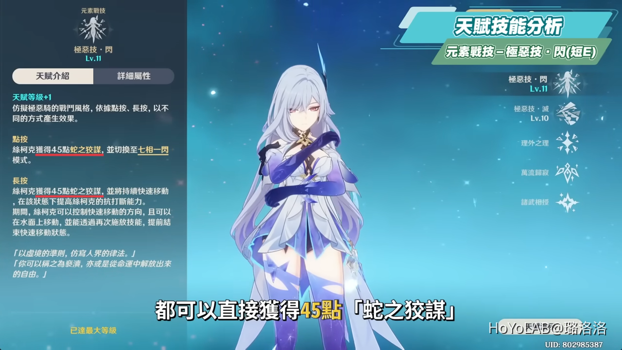 戰技長按後也可以進入一種懸空漂浮移動的狀態,也可以在水面上移動,只是距離並不算遠。若是在大世界想要用這項能力做到更長的漂浮移動距離,則會建議先長按戰技吸取一波能量,吸到覺得足夠的能量後,再點按戰技進入變身型態,而後再按下衝刺鍵,就可以維持這個狀態進行更長距離的水上漂移,但通常有芙寧娜的情況下,一般還是會用芙寧娜來渡河更為方便。實戰中長按戰技就是選擇進入了速切爆發型態,此時會獲取45點「蛇之狡謀」的能量並暫時儲存起來,準備等後續施放大Q的終結技-「照徹萬川」,而在大世界若是常用絲柯克來趕路的話,通常也都會是長E來跑圖,此時遇到敵人時也積了一波能量,開戰時就可以直接丟一個大Q送他一管大的。這裡也有一種情況是,假如開場先用已經儲存一波夠開大Q的能量時,起手先丟一個大Q,而後點按E進入普攻站場模式,這時由於Q按鍵會處於冷卻狀態,所以就要再透過長按重擊來吸取裂隙。但若是這樣的打法時,搭配「深廊終曲」套裝也會有暫時6秒的BUFF效果吃不到。因此這時候就可以在這6秒切出其他的冰C來接力補傷害,6秒後再切出絲柯克站場普攻開砍,也就是後面組隊實戰時會提供的雙C流速切玩法。