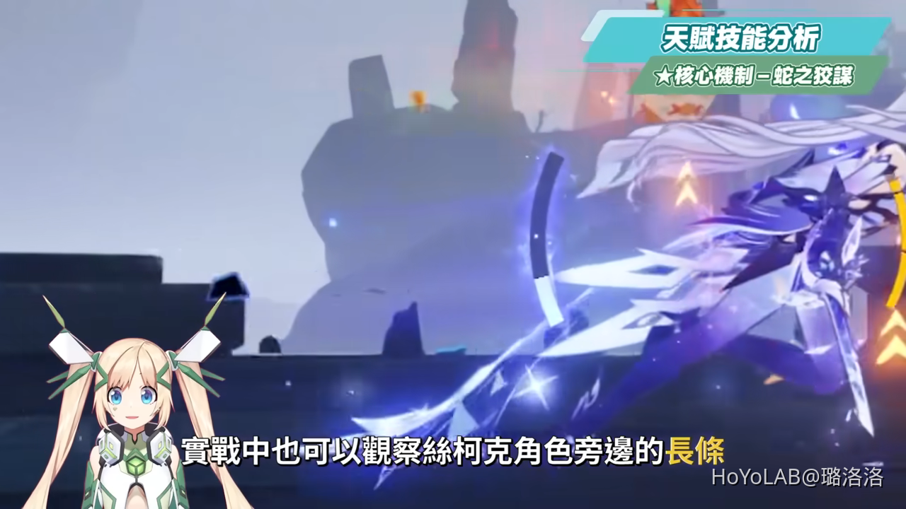 在解說絲柯克的技能機制之前,我們先來了解絲父的核心機制,由於絲柯克和瑪薇卡一樣都是沒有大招能量的角色,取而代之的是一種特殊的能量-「蛇之狡謀」。「蛇之狡謀」搭配戰技使用時,可以用來作為延長強化型態的持續時間,或是用來作為施放元素爆發的能量消耗。實戰中也可以觀察絲柯克角色旁邊的長條,表示當前持有的「蛇之狡謀」能量,上限為100點。