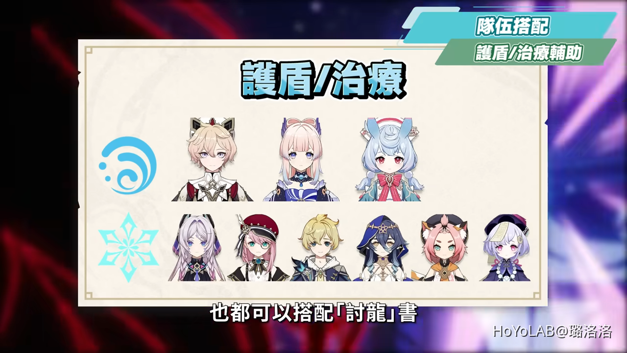 而在護盾/治療輔助人選上也有很多角色可以選擇,盡量優先選擇有增傷能力的,像是其中可以拿法器的角色也都可以搭配「討龍」書,提供額外的加攻輔助能力,像是夏洛蒂、心海、芭芭拉等等。而其中米卡和塔利亞這兩個角色除了在提供治療和護盾輔助上,還有提供加攻速的效果,由於絲柯克站場普攻時,若提高攻速也可以增加DPS,因此也變像是增傷的一種方式,所以這兩個角色也可以選擇,甚至是一起搭配,一人穿「宗室」4件、一人穿「昔時」4件,只是攻速加成到一定程度後,傷害的表現上就不會再更高了,因此建議是搭配其中一個攻速輔助就好。