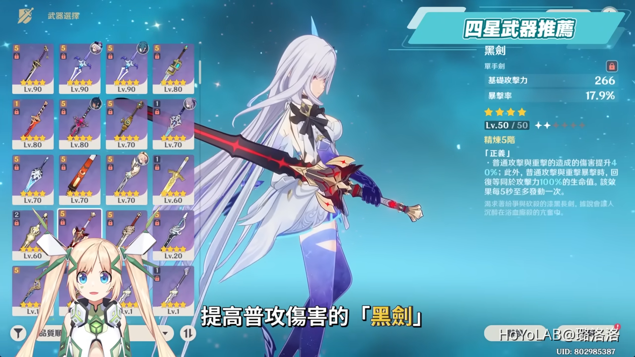 四星武器也可以選擇提高普攻傷害的「黑劍」,或是速切爆發玩法也可以選擇「狼牙」提高大招傷害,有搭配治療輔助可以選擇「海淵終曲」,搭配護盾角色,例如塔利亞也可以選擇「厄水之禍」,或是其他有提供攻擊的武器,因為冰隊本身是比較缺攻擊的。