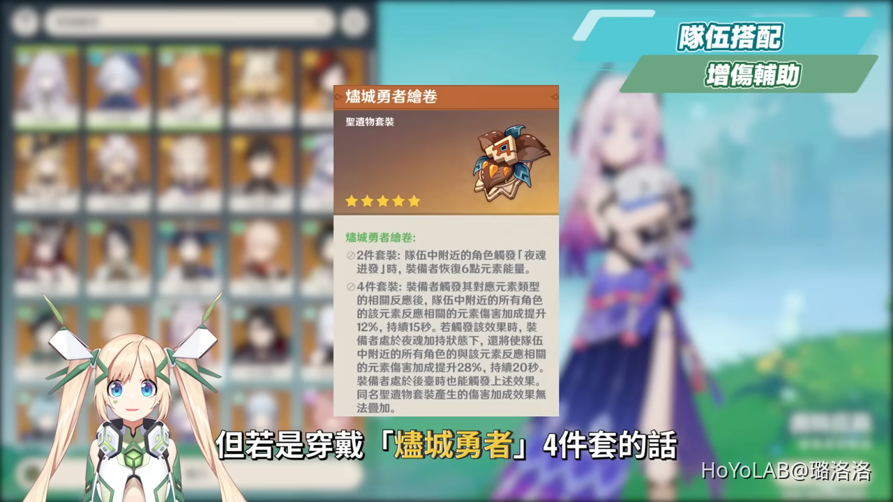 此外在增傷輔助人選也可以選擇茜特菈莉,雖然奶奶主要是提供水/火輸出角色增傷,但若是穿戴「燼城勇者」4件套的話,