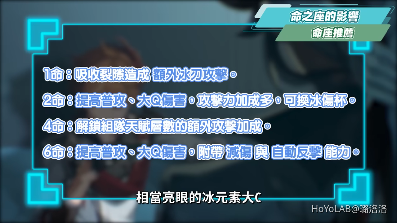 而若是在「七相一閃」的站場普攻時,可以使絲柯克受到的傷害降低,持續15秒。若受到傷害時,會消耗1層「極惡技·斬」,並使受到的傷害降低80%,同時對附近敵人進行3次攻擊,視為重擊傷害,每段為絲柯克攻擊力180%的傷害倍率。並且在普攻第3或5段時,消耗1層「極惡技·斬」,並打出協同傷害,視為普攻傷害,每段為絲柯克攻擊力180%的傷害倍率。所以總結6命的效果主要就是多一個增傷BUFF,機制方面主要是讓絲柯克多了減傷以及反擊的效果。但在組隊方面還是脫離不了水/冰,因此以6命完全體的設計來說,洛洛其實更喜歡克洛琳德6命的強化狀態無條件80%減傷+自回血實現單人循環,也比較不綁定隊友,但從冰隊的角度來說,絲柯克也絕對是當前無庸置疑的T0大冰C。