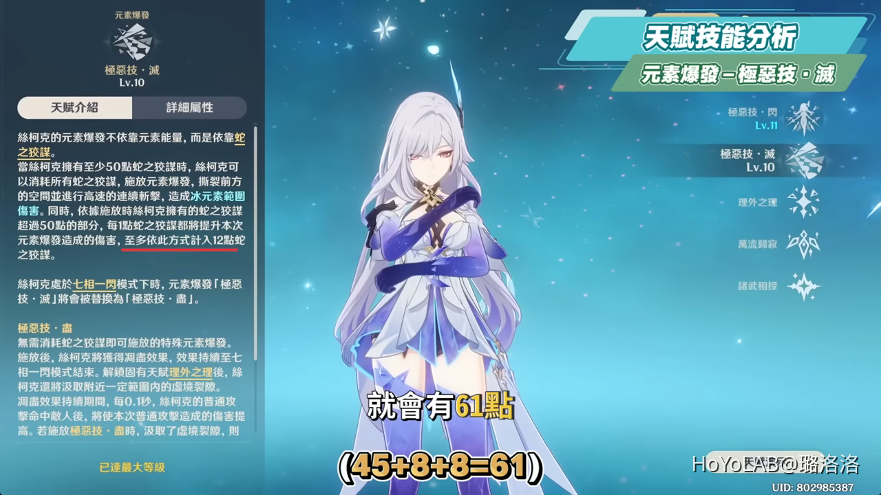 解鎖固有天賦3,只要隊伍中角色均為水或冰元素隊友組成,可以是1冰+3水、雙冰雙水、或是3冰+1水,但不能是純冰隊,否則實戰中無法主動觸發裂隙生成,在這樣的組隊構成下,絲柯克就可以讓隊伍中自己的角色戰技等級直接+1。搭配戰技傷害也不錯的芙寧娜和愛可菲時,也可以讓他們的海鮮惡霸和暴力餐盤傷害更高。和公子的固有天賦也是類似的,只是一個是加普攻等級。