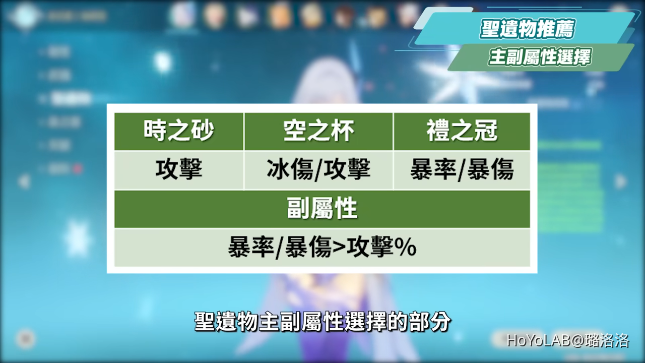 聖遺物主副屬性選擇的部分可以參考表格,時之沙攻擊力、空之杯選擇攻擊和冰傷差距不會太多,選擇自己副詞條較好的即可,禮之冠根據面板選擇暴率或暴傷來配平。副屬性優先考慮雙暴和攻擊力百分比。