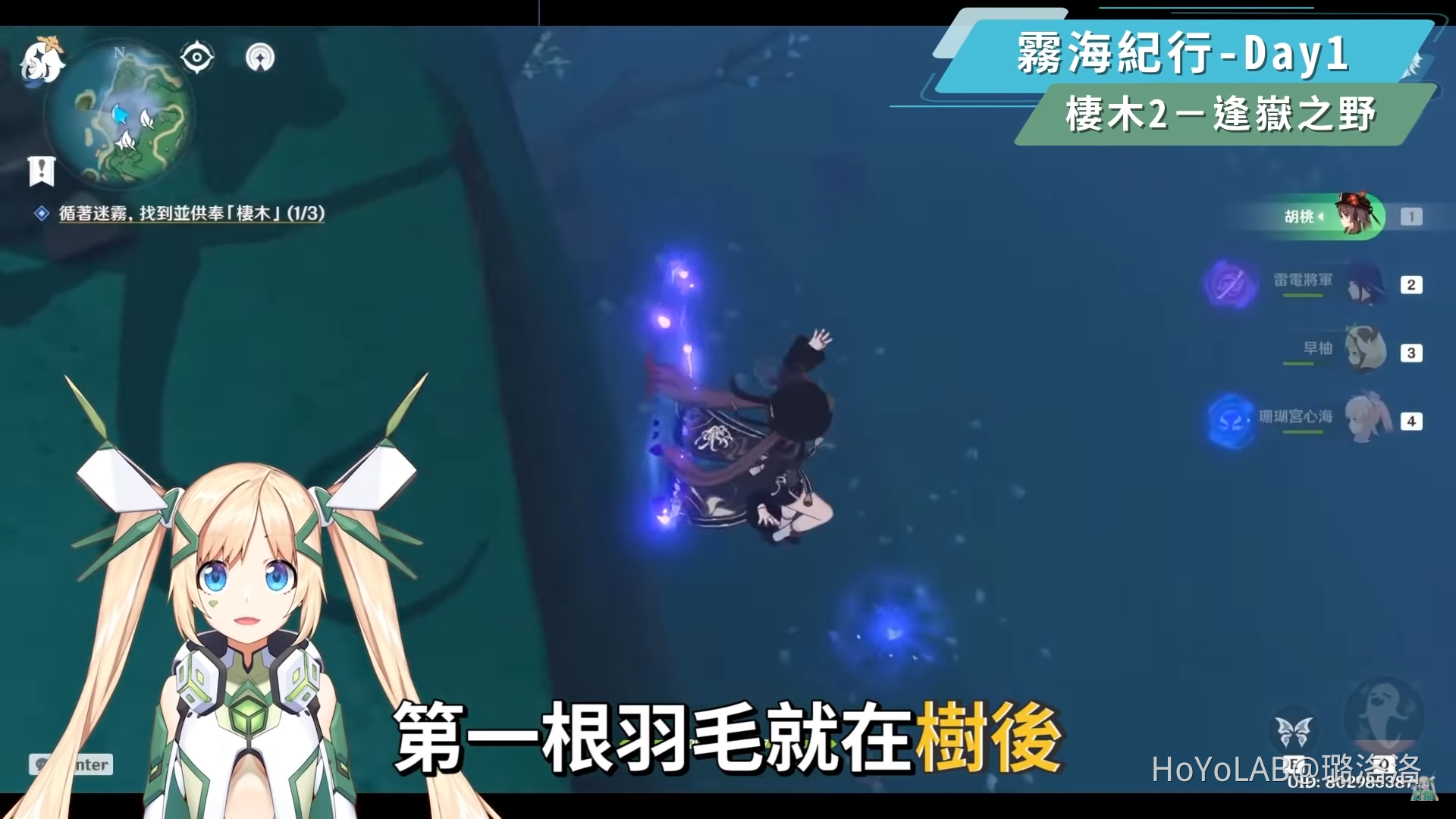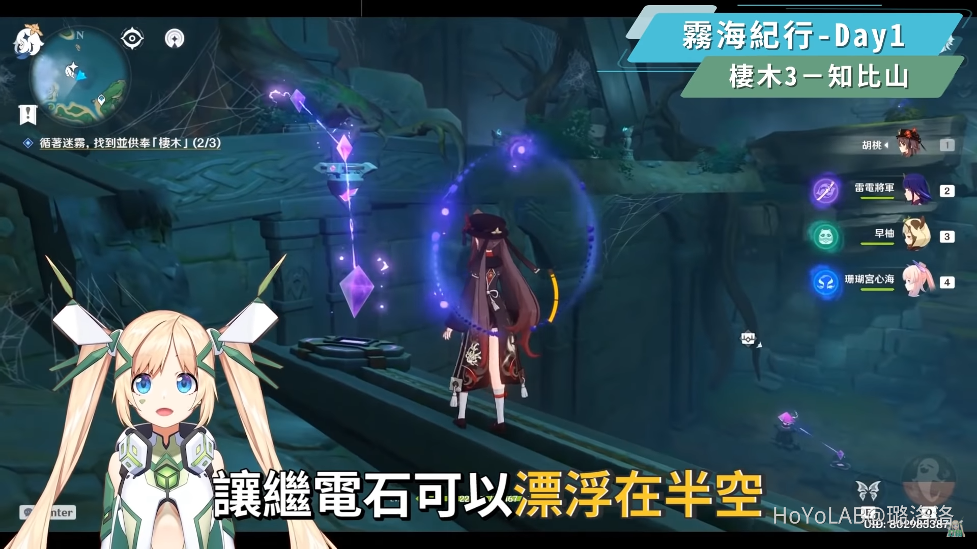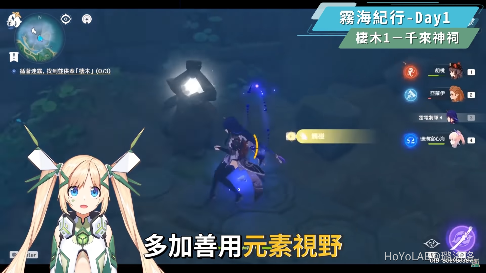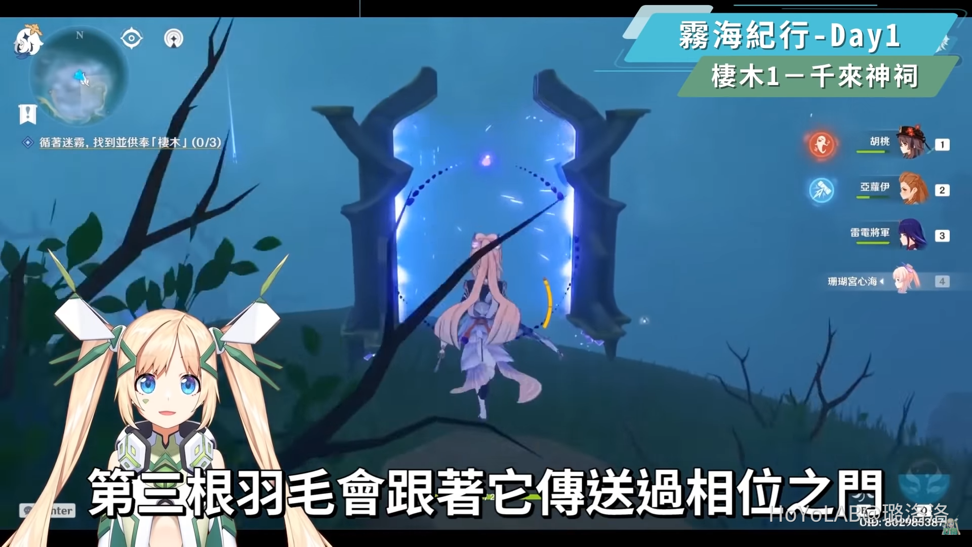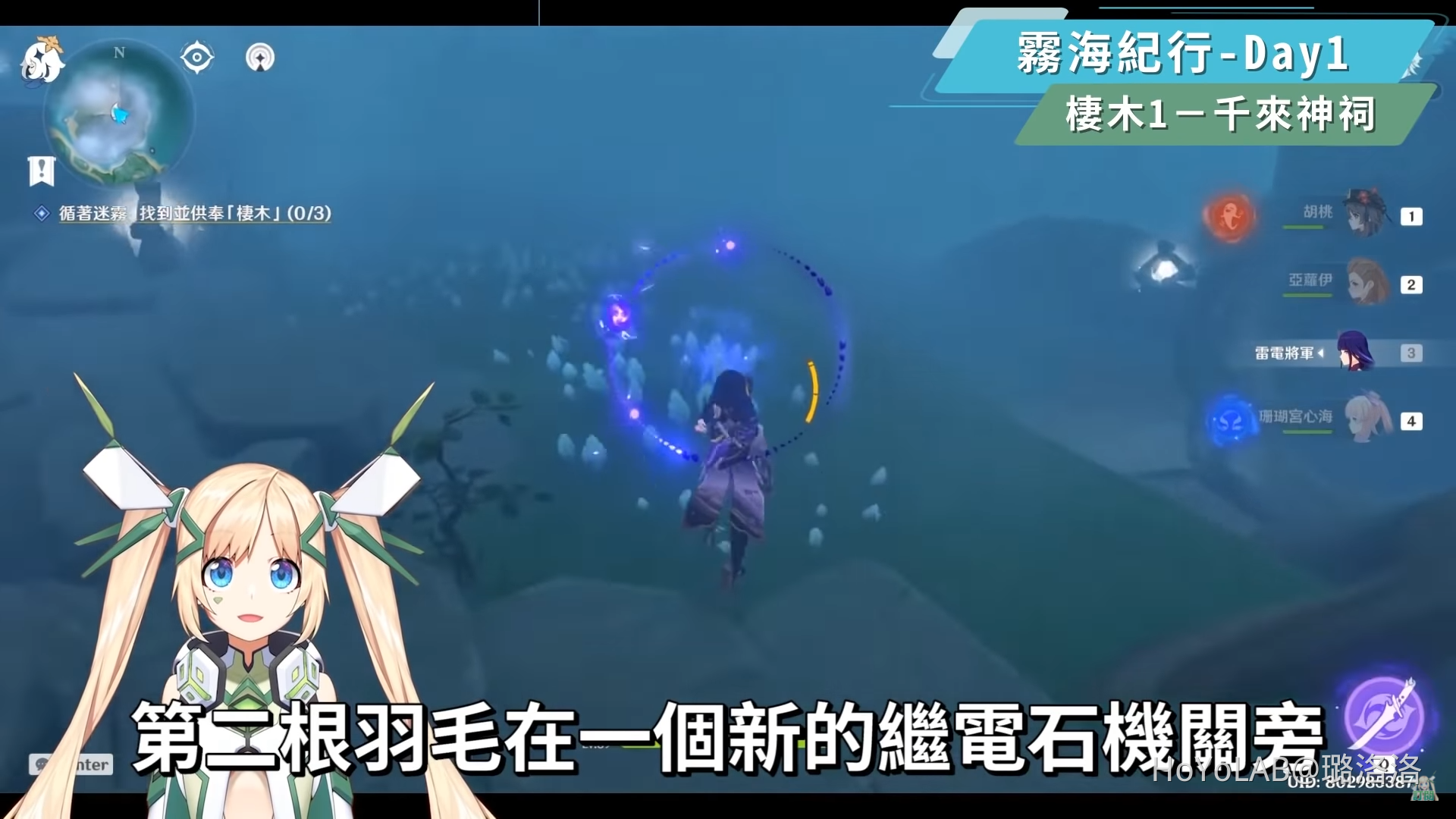 第一個我們先去鶴觀島東邊的千來神祠,因為被迷霧擋住所以可能連地標名稱都看不清楚,如果快靠近棲木所在的位置的話,可以看到路旁會有「光明燈」的指引,如果路上有看到鶴觀特有的「雷石」的話,也可以透過雷元素去點亮,避免在迷霧中待太久被傳送到原點,找到棲木後可以查看小地圖看羽毛的位置,若霧太濃看不清楚也可以多加善用元素視野,第一根羽毛在坑底,第二根羽毛在一個新的繼電石機關旁,第三根羽毛會跟著它傳送過相位之門,半路也可以順便撿一顆雷神瞳,蒐集完畢後回去供奉棲木。
