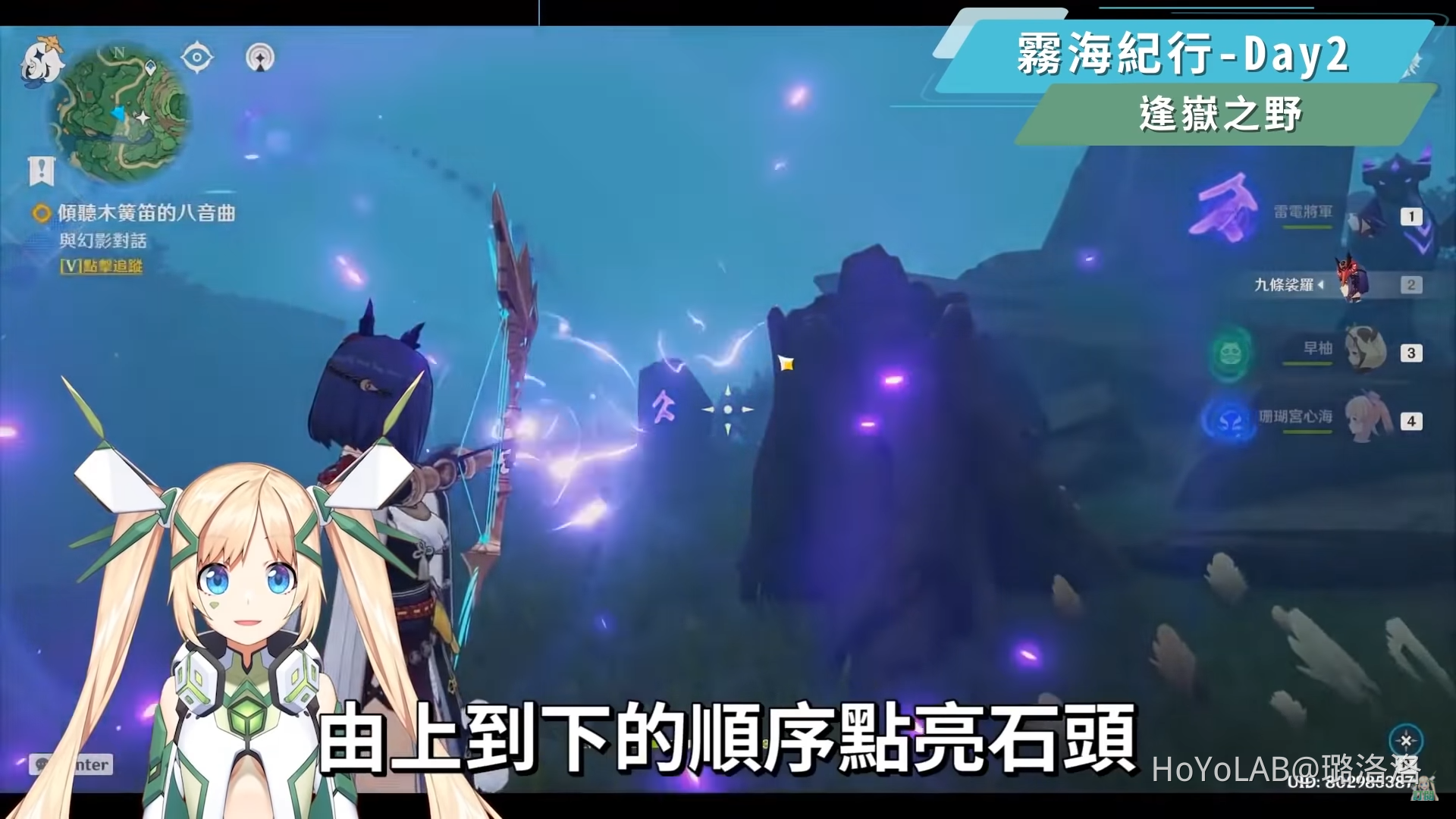 來到逢嶽之野,使用羽毛後會看到阿瑠的幻影,接著我們又要去附近找東西,因此可以先在地圖標個點,以免等等霧太大迷路回不來,路上若是有看到雷石可以用雷元素與其感應,當作回家的光明燈,與雷鳥感應完後會需要找三個石頭,我們只要跟隨三個仙靈找到石頭即可。最後擺放完三個石根文字後,再按照仙靈歸位顯示的符號由上到下的順序點亮石頭。