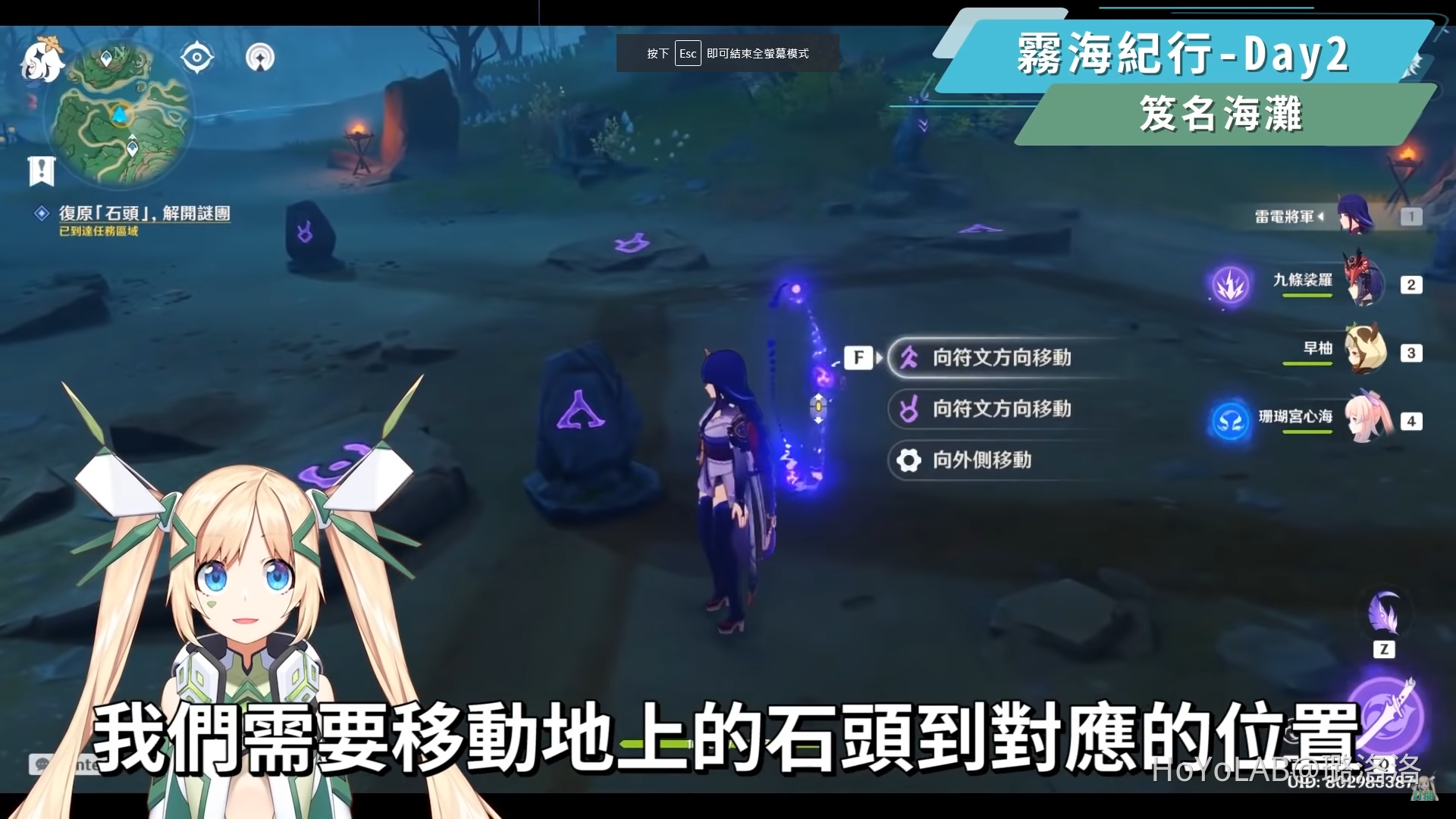 到達笈名海灘後一樣使用羽毛與雷鳥石像感應,看完這裡的劇情線索後,我們需要移動地上的石頭到對應的位置,移動的方式不難,只要讓對應符號的石頭回到對應的位置即可。