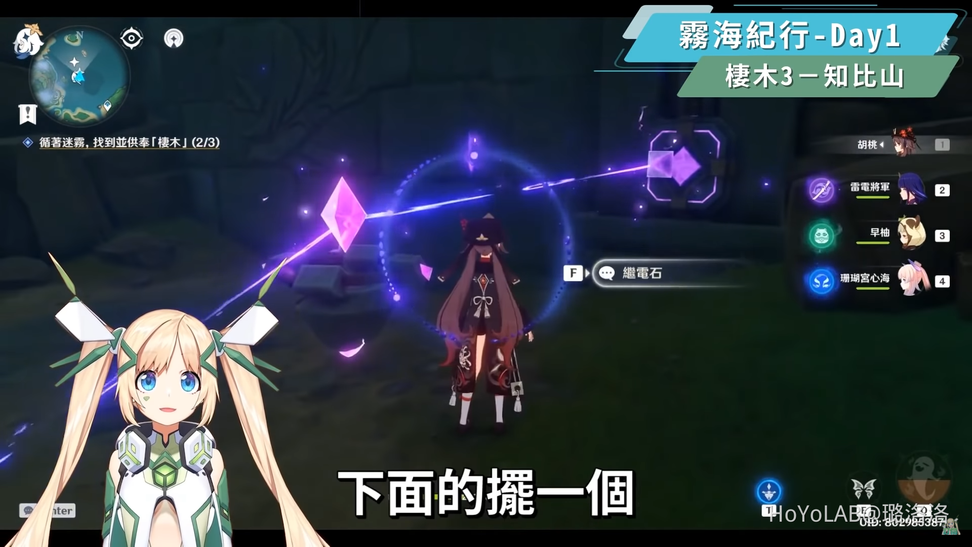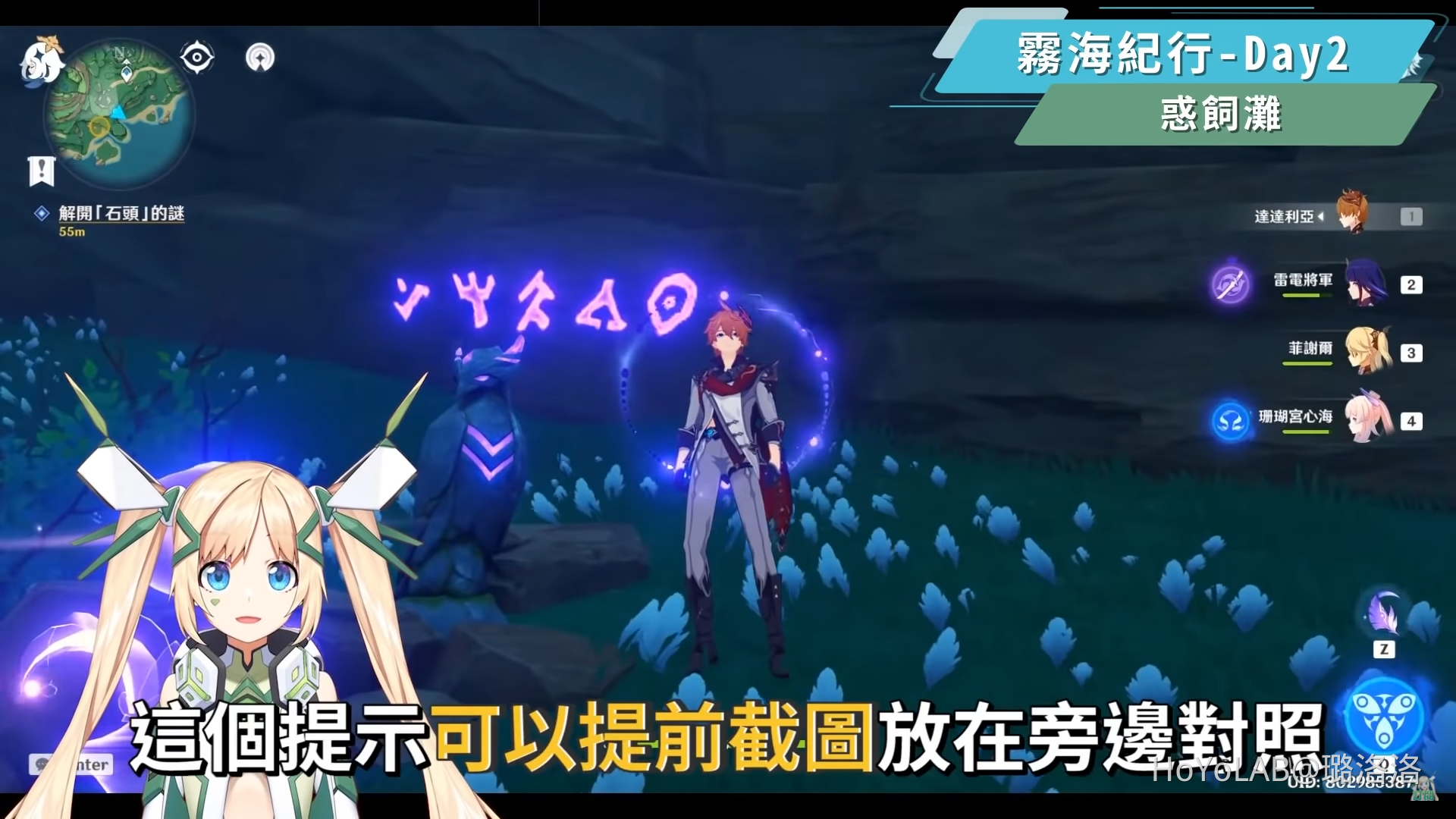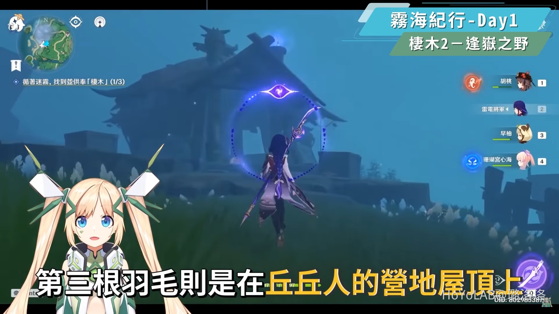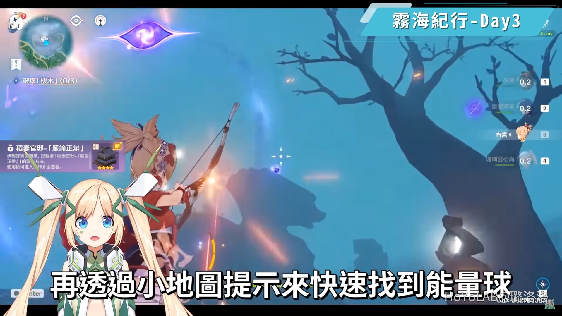 第三天先跟著指引去找阿釜,之後再前往鶴觀,一樣從對應的石門進入讓霧消散,而後得知我們需要拆除之前供奉好的三座棲木,若是第一天有乖乖標點的話,就會比較容易找到之前棲木的位置,找到棲木後可以直接攻擊,攻擊到半血時會有能量球飛出,再透過小地圖提示來快速找到能量球,並且也可以善用冰火元素的弓箭系角色攻擊能量球少走一點路,像是安柏、埃羅伊、甘雨、宵宮等等。打完能量球再回來打掉剩下半血的棲木。