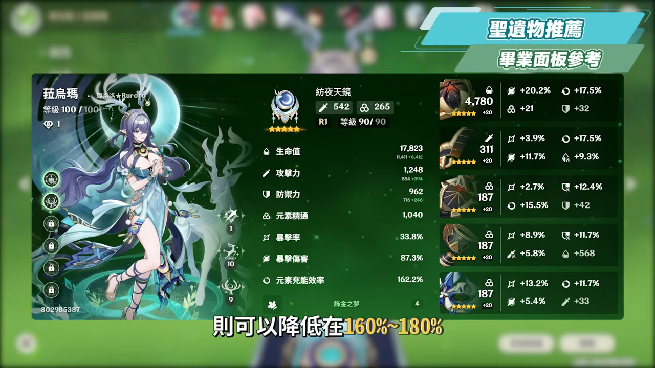 菈烏瑪的畢業面板參考,若隊伍中只有菈烏瑪1名單草的話,元素充能會建議在180%~200%左右,假如有雙草的話則可以降低在160%~180%。隊伍中若是還有搭配西風系列的武器則還可以再降低一些要求。實戰中主要確保大招能夠無縫循環,剩下就是精通越高越好。菈烏瑪也是在1級情況下就自帶200點精通的辣個女人,因此成形後搭配精通屬性的武器,很容易精通就可以突破至少1200~1400點以上。若是面板真的很好,或是滿命的菈烏瑪,也可以在精通有800後、酌量堆雙暴讓暴率在40%、暴傷80%左右。
