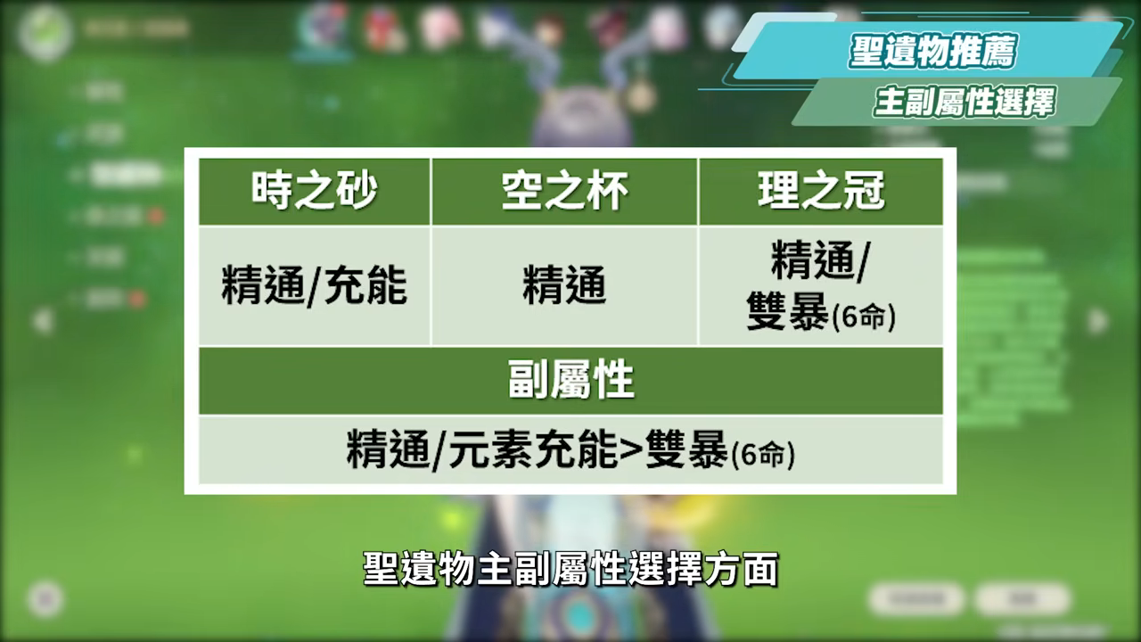 聖遺物主副屬性選擇方面,菈烏瑪主要最需要的屬性就是精通和充能,因此可以根據面板在時之沙選擇精通或充能,空之杯精通,理之冠在非滿命狀態下都是優先選擇精通,滿命後可以根據面板選擇雙暴。副詞條同樣優先堆疊精通和充能,充能足夠的情況下就精通越高越好,有雙暴也可以酌量搭配,滿命想多打點輸出的話則可以多多益善。