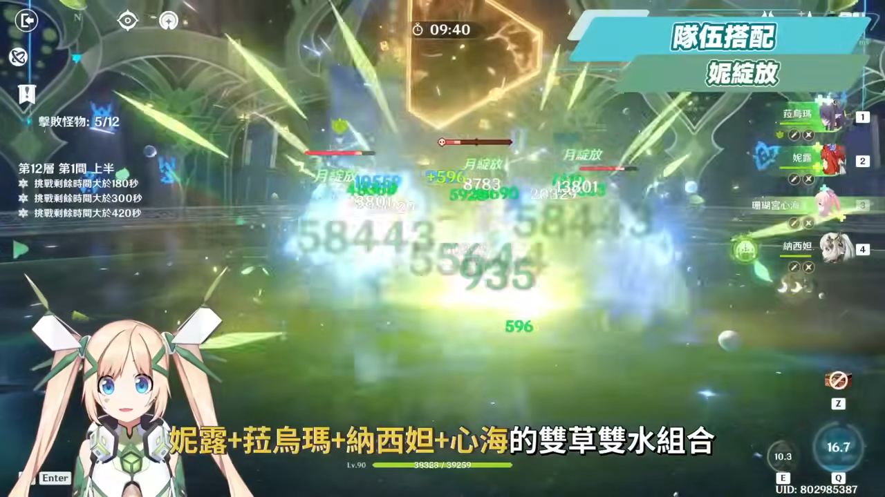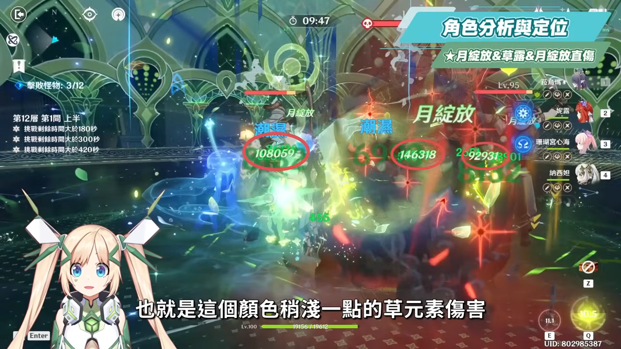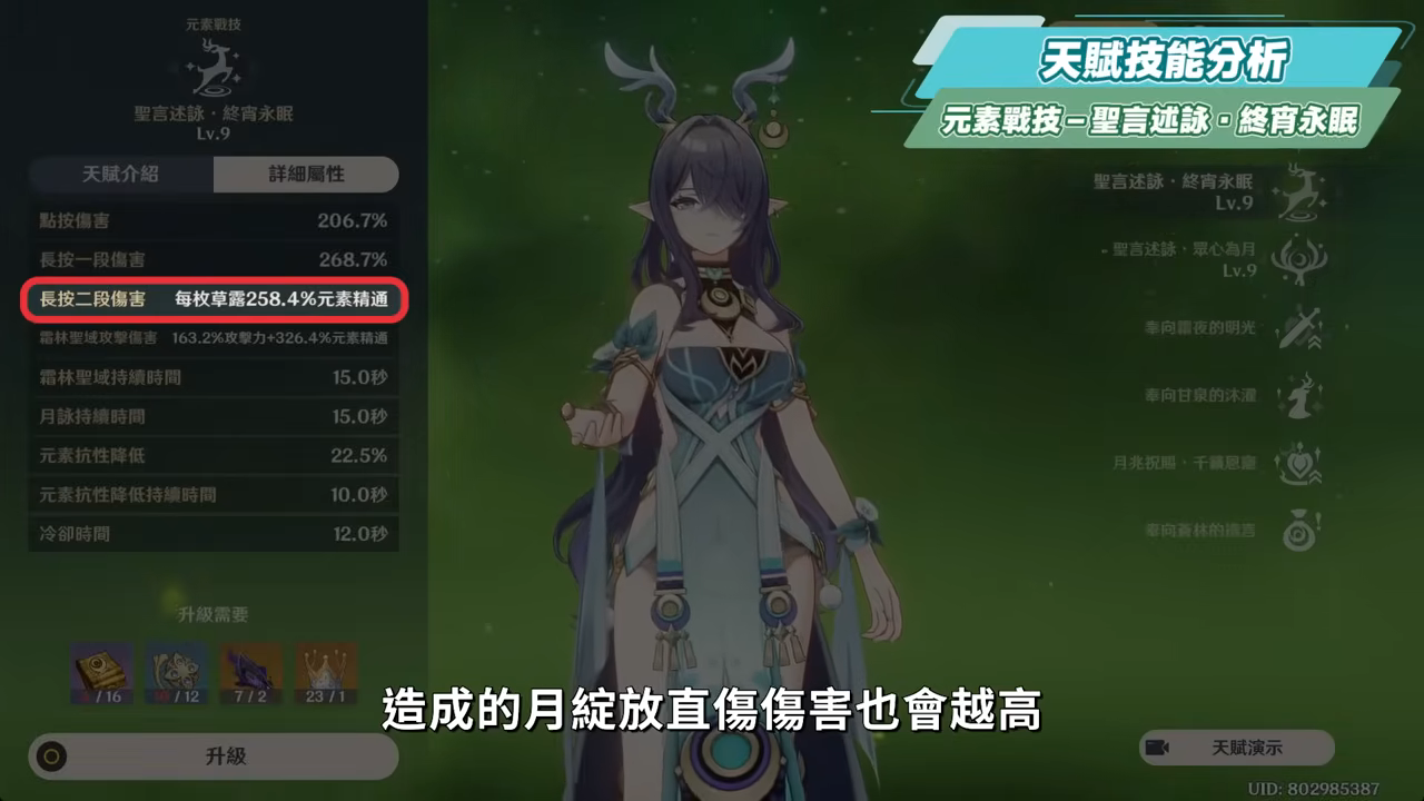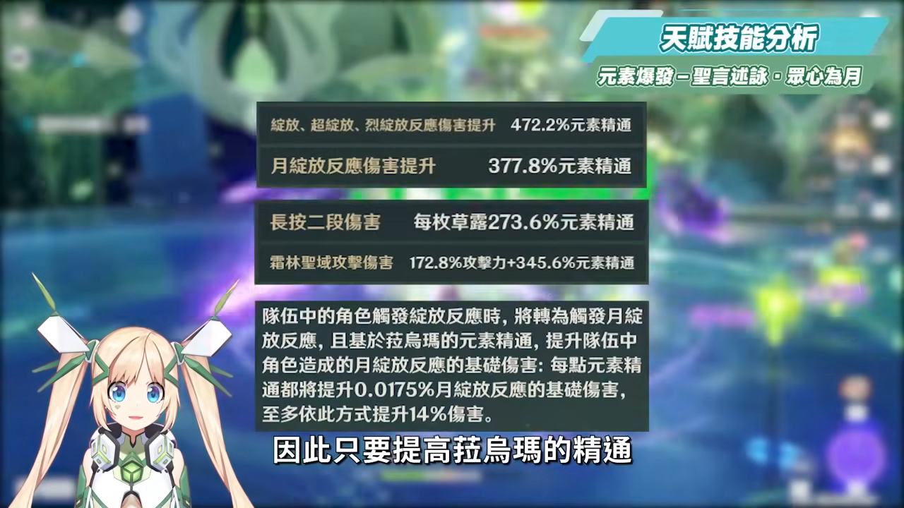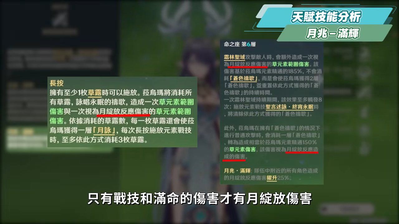 這個「草露」的機制能量,基本上也可以視為和元素爆發能量類似的「可繼承資源」,像是我們在深境螺旋打完第1間,來到第2間或第3間時,第1間遺留的「草露」也會被繼承,或是把菈烏瑪從隊伍中換下來再換上去後,原有累積的「草露」也都會還在。而「月綻放直傷」會再受到角色等級、技能等級、精通、雙暴、敵人草抗、菈烏瑪天賦加成的影響。