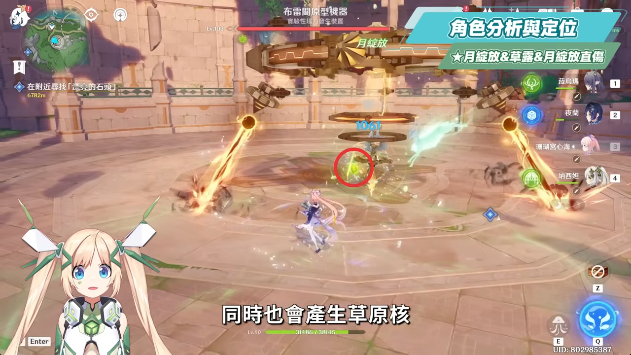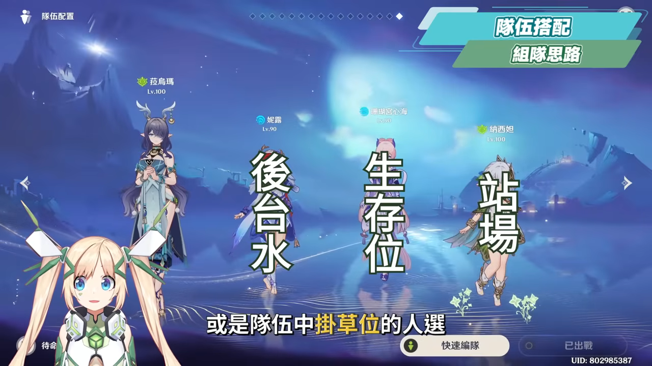大致上說完菈烏瑪的核心技能,這裡也可以稍微梳理一下菈烏瑪實戰中的手法,由於菈烏瑪的「草露」要累積到3枚需要7.5秒,因此通常在綻放隊中都是先讓其他隊友上場,放一些脫手的草元素或水元素技能,同時觸發月綻放,此時再觀察右側角色列表下方的「草露」累積滿3枚、或是快滿3枚時,就可以切出菈烏瑪,這裡也有個重點,菈烏瑪登場時,假如敵人附著的是水元素,登場後可以先平A一下,這樣可以清除水附著、進而多產生草原核,後續再開Q大招,提供18層禱歌,菈烏瑪再長按E戰技,提供水/草雙減抗,並消耗「草露」轉化「月詠」,後續循環就會穩定再獲得最多18層禱歌,同時菈烏瑪的月綻放直傷,可以吃到Q大招施放後的禱歌加成,因此也會建議盡量先Q後E,或是盡量在有3枚「草露」,大招期間再切出菈烏瑪出來長E,菈烏瑪退場後,領域還會持續提供後台範圍掛草,再切出其他隊友站場產生更多種子,並進行循環。