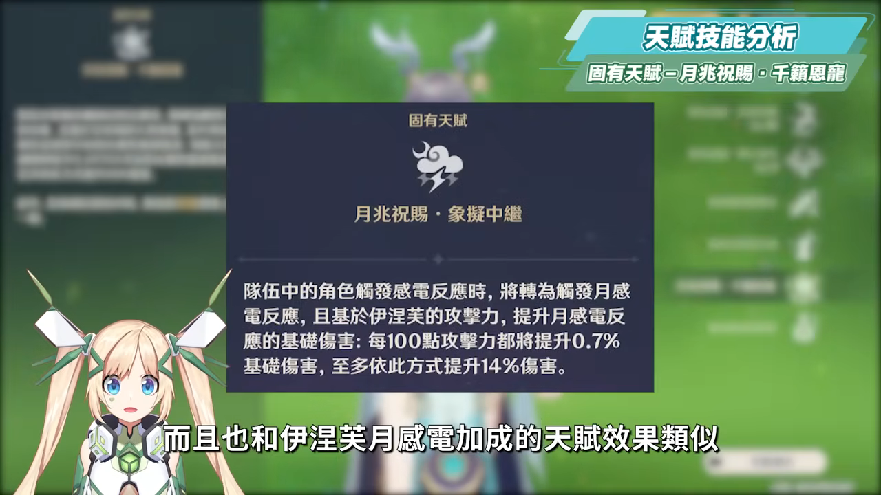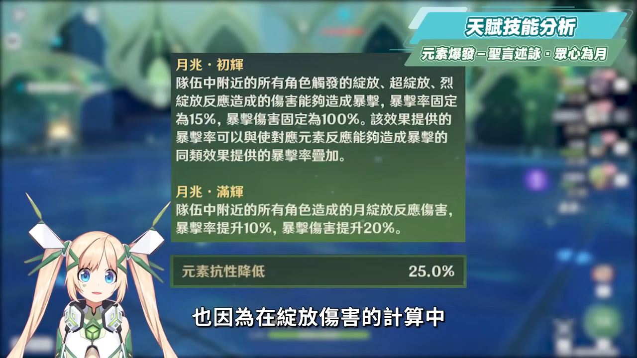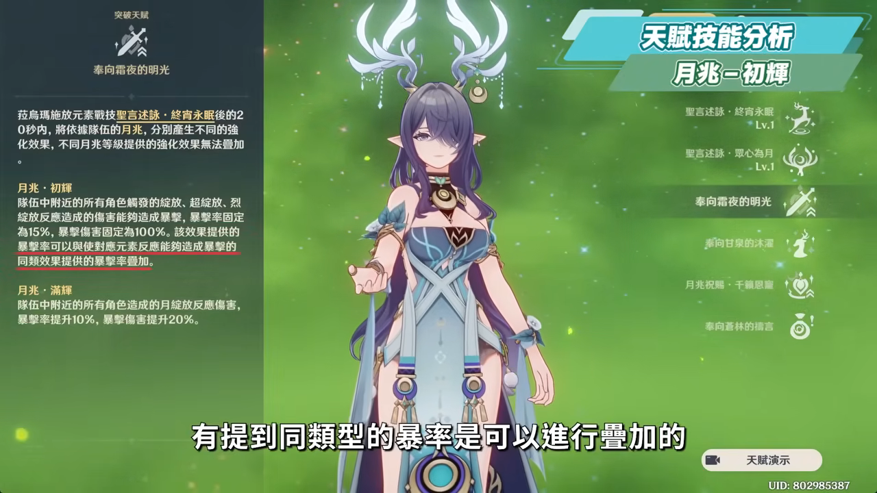 再來是補充關於菈烏瑪的月兆機制,當處於「初輝」等級時,也就是隊伍中只有菈烏瑪1名擁有月兆機制的角色,可以使綻放相關反應的傷害能夠吃到雙暴,暴率固定為15%、暴傷100%,此外這裡的敘述有提到同類型的暴率是可以進行疊加的,因此若你擁有2命的納西妲,那就可以再加20%暴率,總共35%的暴率。