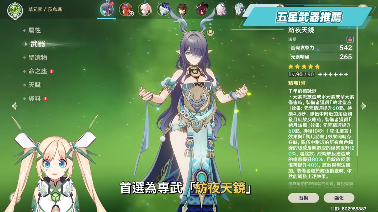 菈烏瑪的武器推薦,首選為專武「紡夜天鏡」,搭配戰技造成草傷、以及觸發月綻放反應時,總計可以獲得120點精通,前置兩個效果都觸發後,可以再提高全隊的綻放反應相關傷害倍率,綻放傷害提高120%、超綻放、烈綻放傷害提高80%、月綻放傷害提高40%。菈烏瑪的專武比較偏向數值,同時兼具輸出和輔助,下位替代選擇有很多,五星武器的精通向武器可以選擇的像是納西妲專武「千夜浮夢」、茜特菈莉專武「祭星者之望」、夢見月瑞希專武「寢正月初晴」等等。