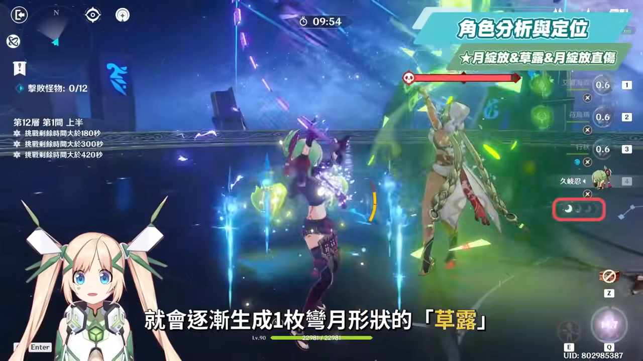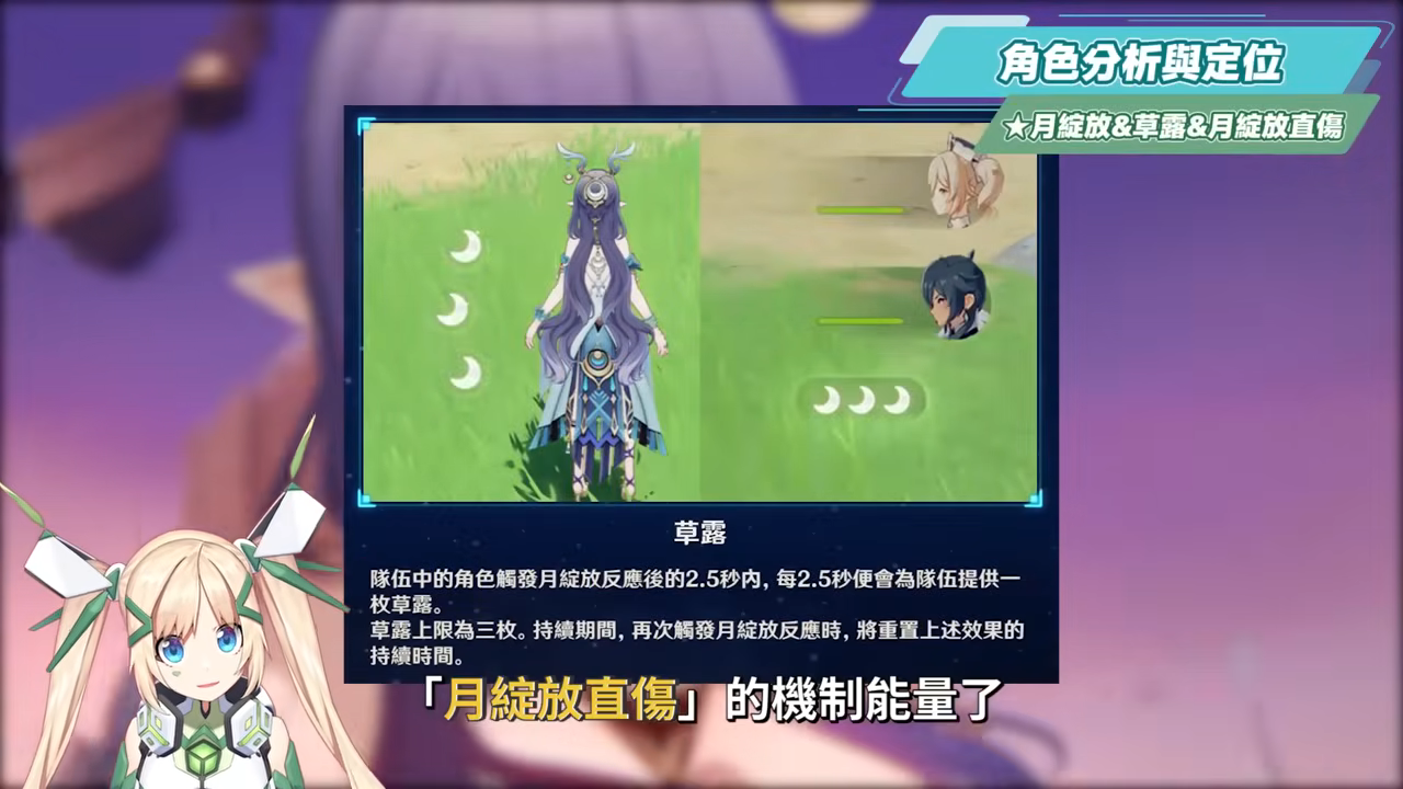 那「月綻放」是要做什麼的呢?只要觸發「月綻放」的字樣後,右側角色列表的下方就會逐漸生成1枚彎月形狀的「草露」,每2.5秒最多生成1枚,只要過程中持續有水+草元素補充,在7.5秒後就能擁有最多3枚。