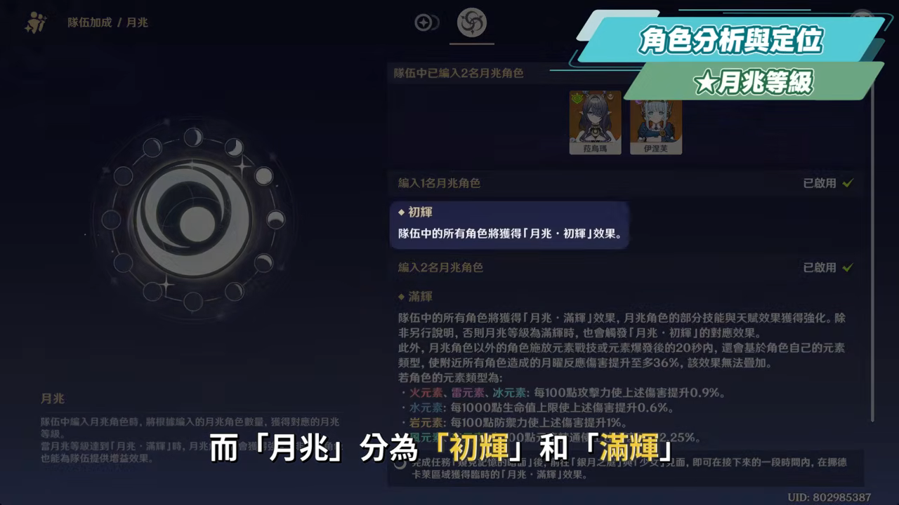 這裡洛洛也要對初來乍到挪德卡萊的旅行者和萌新們,補充一下月之一版本的新機制。在挪德卡萊的角色中,部分角色會受到月光的賜福,因此只要具有「月兆」機制的挪德卡萊角色組在一隊時,就可以提高該角色的「月兆」等級,同時解鎖一些額外的特殊效果,有些類似納塔角色的「夜魂迸發」。而「月兆」分為「初輝」和「滿輝」,可以理解成「初輝」就是隊伍中只有1名挪德卡萊角色,比如隊伍中若只有菈烏瑪,那就只有「初輝」。而「滿輝」則是有2名以上挪德卡萊角色。並且針對不同元素的角色,還會有對應的傷害提升。像是再組入解完主線免費送的愛諾,就能升級成「滿輝」。那以菈烏瑪的「月兆」機制來看的話,在「初輝」狀態下,可以使全隊觸發的綻放、超綻放、烈綻放反應的傷害能夠吃到雙暴,暴率固定為15%、暴傷固定為100%。而當菈烏瑪的月兆達到「滿輝」時,則是使全隊的月綻放反應暴率提高10%、暴傷提高20%。「初輝」和「滿輝」的效果只能觸發一種,因此可以根據自己需要的效果來去調整月兆等級。其他關於菈烏瑪的月兆效果,稍後影片會再補充在技能說明的篇幅中。