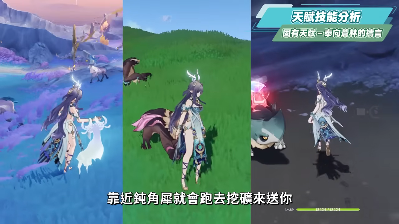 在探索天賦方面,菈烏瑪作為挪德卡萊的首發角色,也有著能夠顯示小地圖特產位置的功用。另外一個作用則是能夠驅使受到月矩力影響的部分動物,提供不同的效果,像是靠近凜角鹿就可以補血,靠近鈍角犀就會跑去挖礦來送你,靠近帔髦獾也會將自己珍藏的食糧獻出,整個挪德卡萊的小動物都是菈烏瑪的粉絲呀!就算你後來再把他們擊斃了,他們也無怨無悔。並且只要菈烏瑪在隊伍就可以生效。