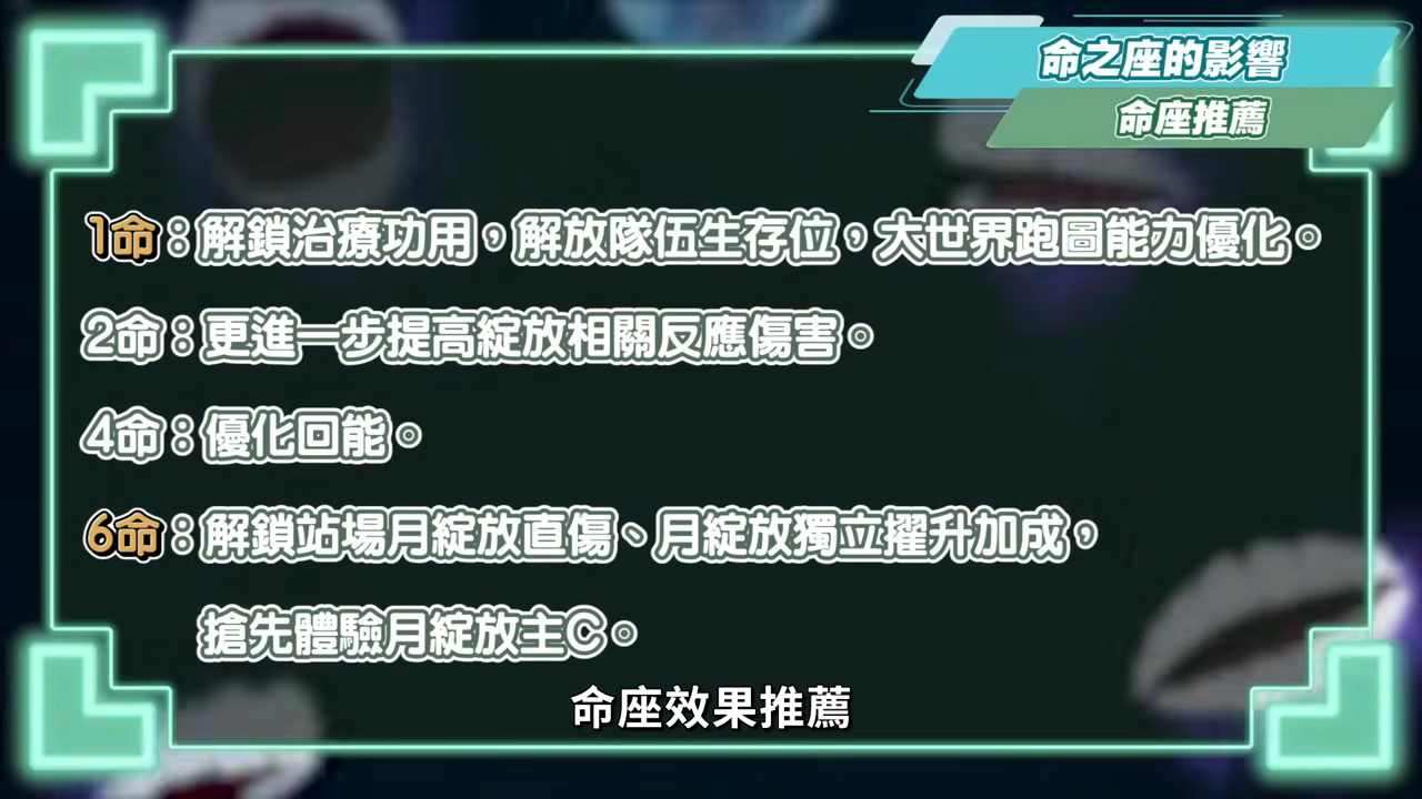 菈烏瑪的1命可以在施放E戰技或Q大招後解鎖一個20秒的治療效果,治療量會基於菈烏瑪的精通來轉化,常態畢業練度下,每1.9秒可以治療7000~8000左右的奶量,條件是要觸發月綻放反應,也是非常不錯的,雖然對於傷害層面沒有加成,這個1命更多的作用是讓菈烏瑪解鎖一個奶媽的效果,作為一個像是*奶媽的角色,1命以後再也不是花瓶,真真正正實現奶媽的作用,也會讓隊伍解放一個治療位的格子,因此就能放進上限更高的輔助或後台輸出型角色,因此也變相是提高整個隊伍的傷害。另外一個效果則是優化大世界跑圖能力,不僅降低體力消耗,也讓跑圖的持續時長從10秒提高至15秒。