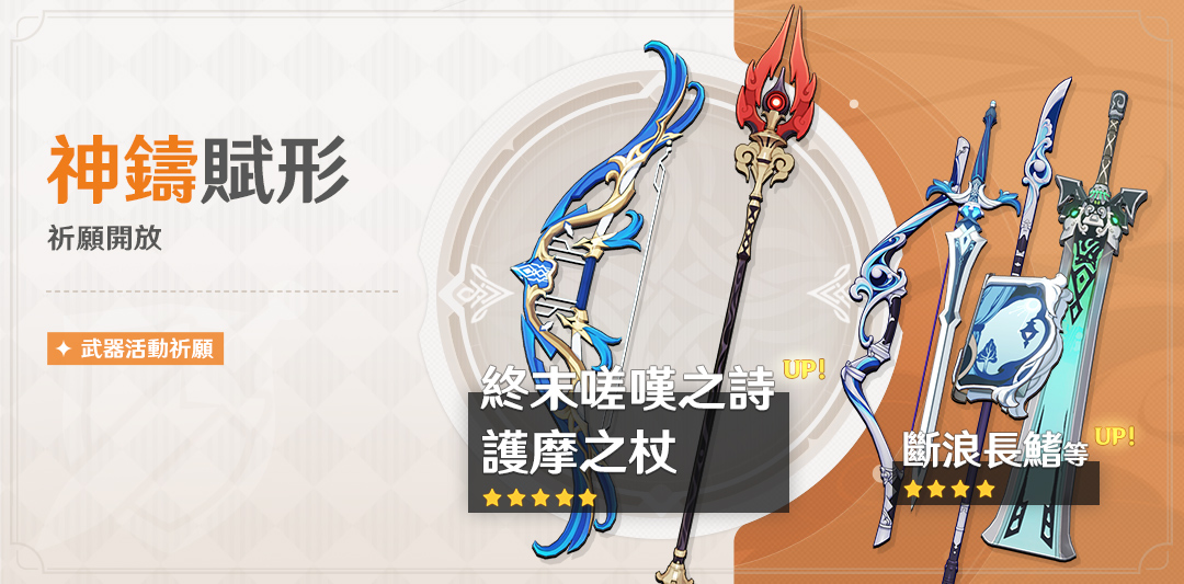 ●活動期間,可使用「神鑄定軌」對本期五星UP武器「長柄武器·護摩之杖」或「弓·終末嗟嘆之詩」進行定軌。更多「神鑄定軌」詳細規則可點擊祈願介面左下角的【詳情】按鈕查詢。